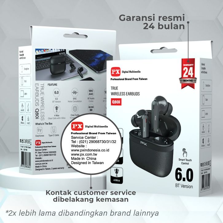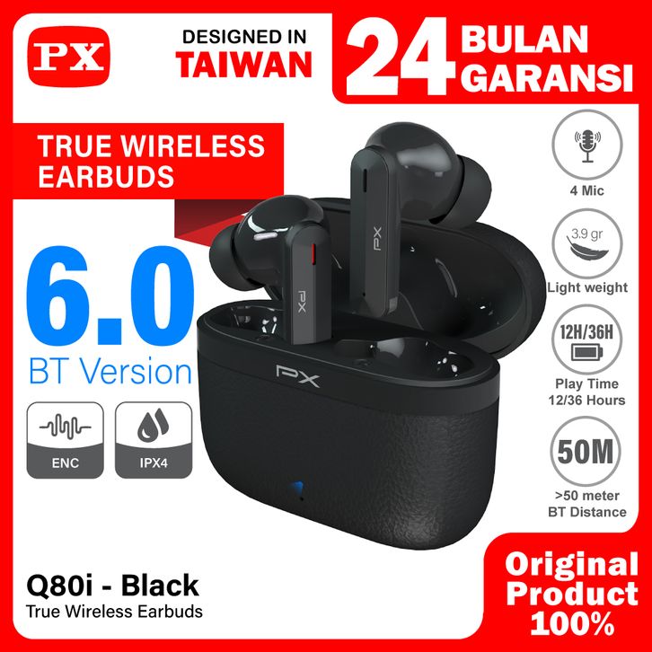 Headset TWS Earphone Bluetooth 6.0 Earbuds Headphone True Wireless ENC 4 Mics IPX4 PX Q80i - Black