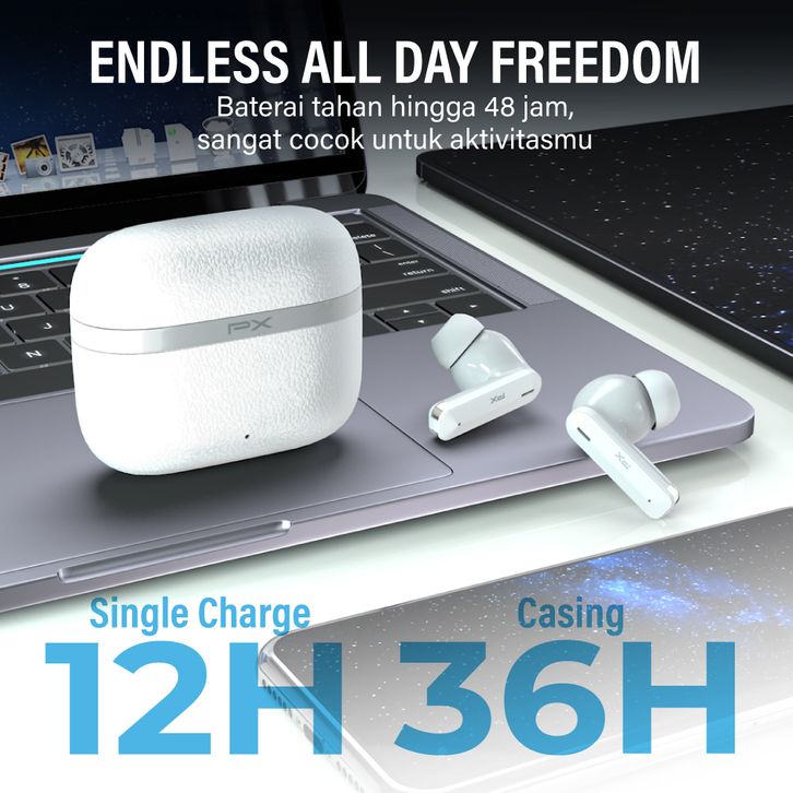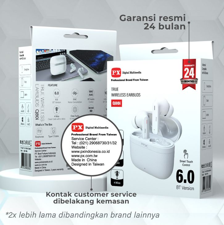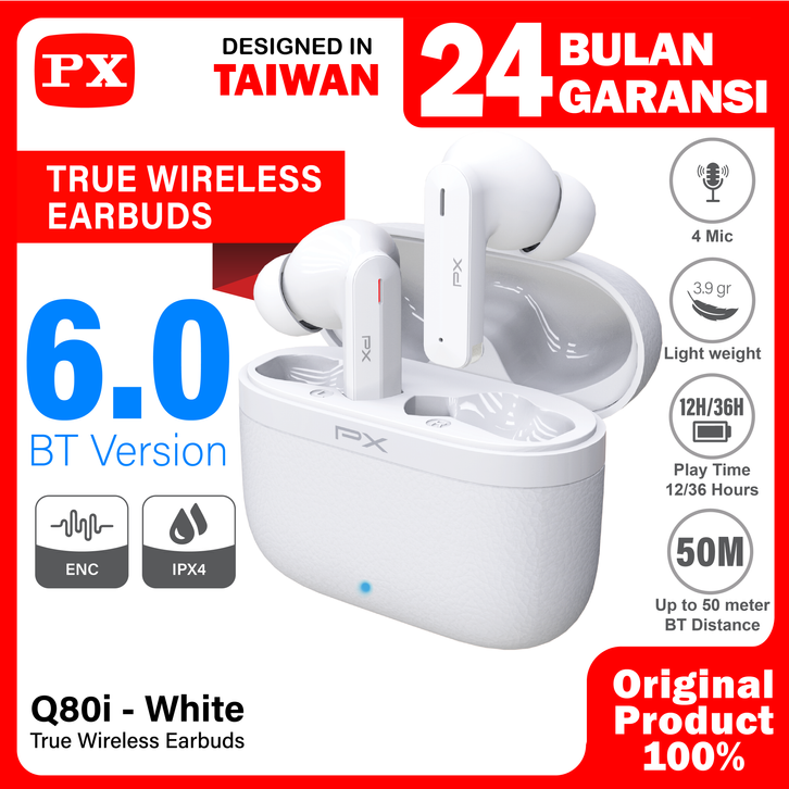 Headset TWS Earphone Bluetooth 6.0 Earbuds Headphone True Wireless ENC 4 Mics IPX4 PX Q80i - White