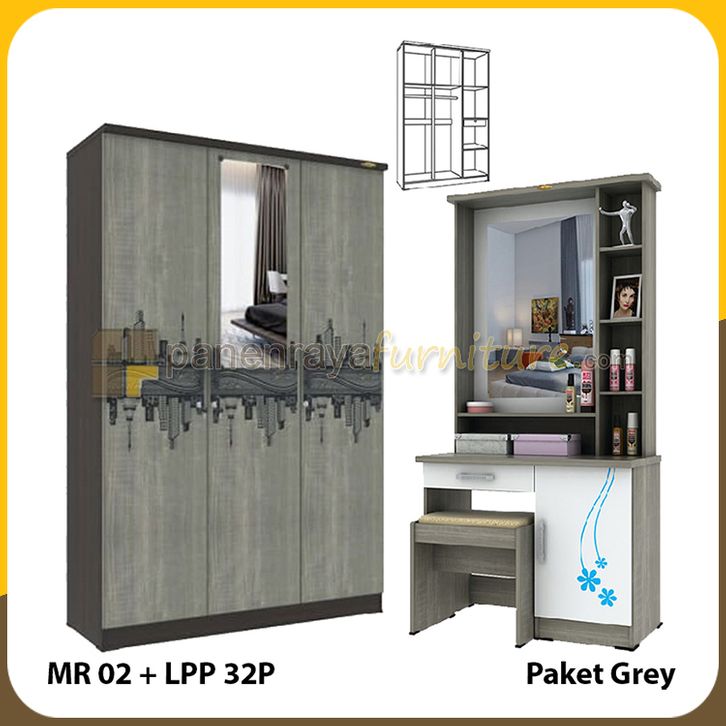 PanenRaya PAKET Lemari Pakaian Romaro MR02 + LPP32P Grey + Meja Rias Minimalis