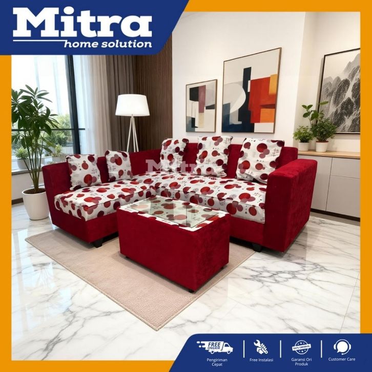 Sofa kain L/ Sofa L minimalis warna merah motif/ free ongkir