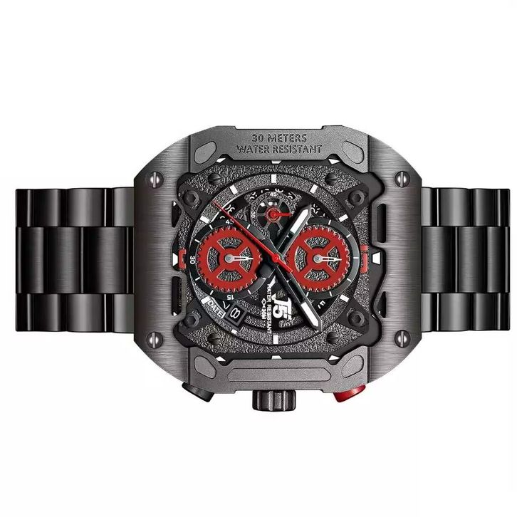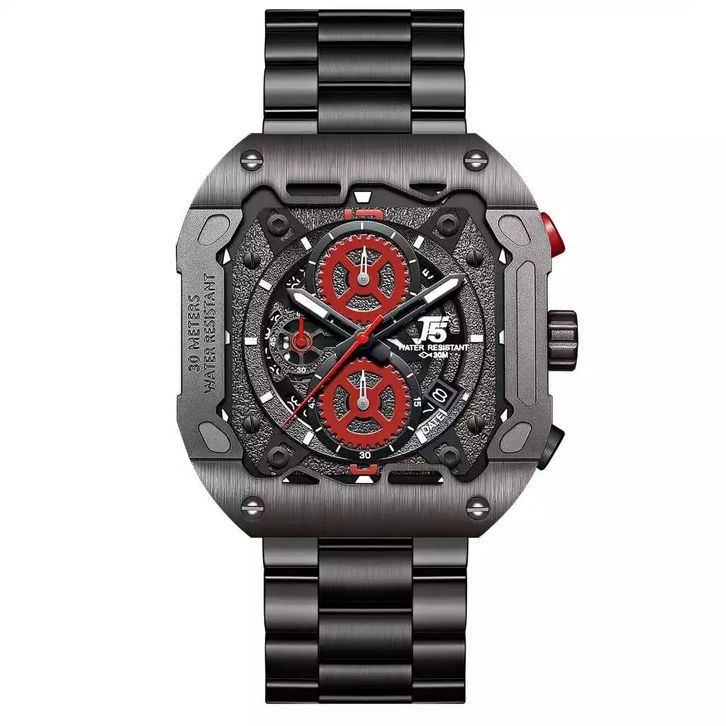 Jam Tangan Pria T5 H 4105 BLACK RED STAINLESS STEEL Original Chronograph Bergaransi-Free tin box