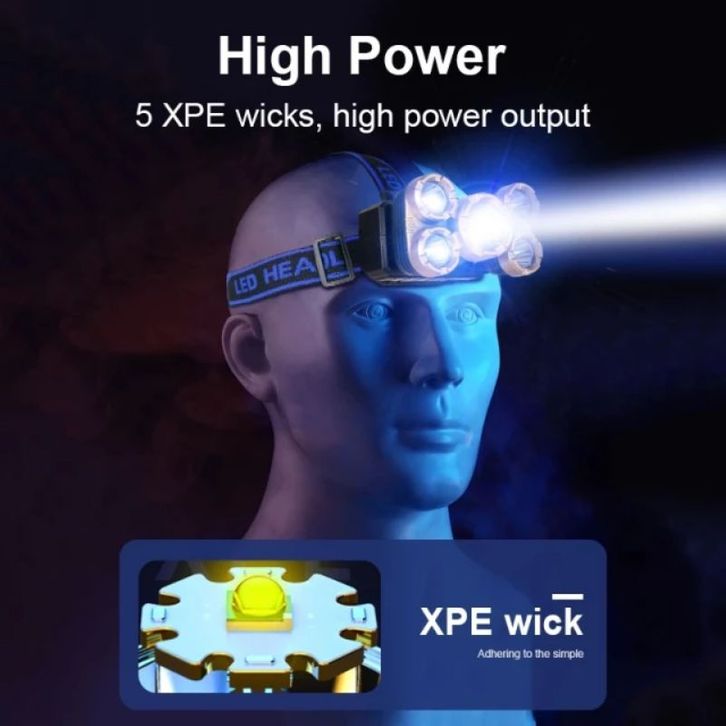 Senter Kepala 5 LED Super Terang USB Rechangeable Waterproof Anti Air 45w 4Mode Cahaya Putih