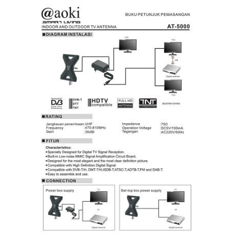 AOKI Antena TV In/Outdoor Digital TV DVB-T2 dengan Booster dan Power Inserter AT5000