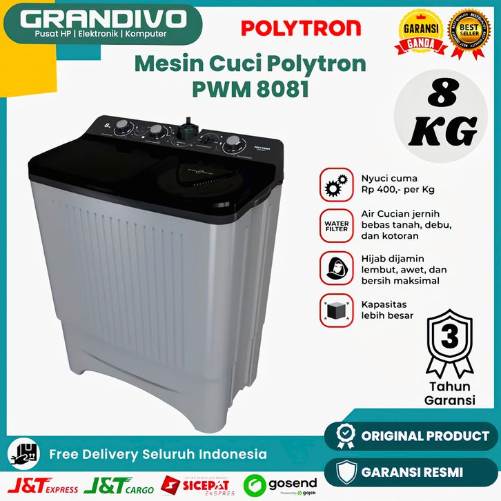 POLYTRON MESIN CUCI 2 TABUNG 8 KG PWM-8081Y GARANSI RESMI - GRANDIVO