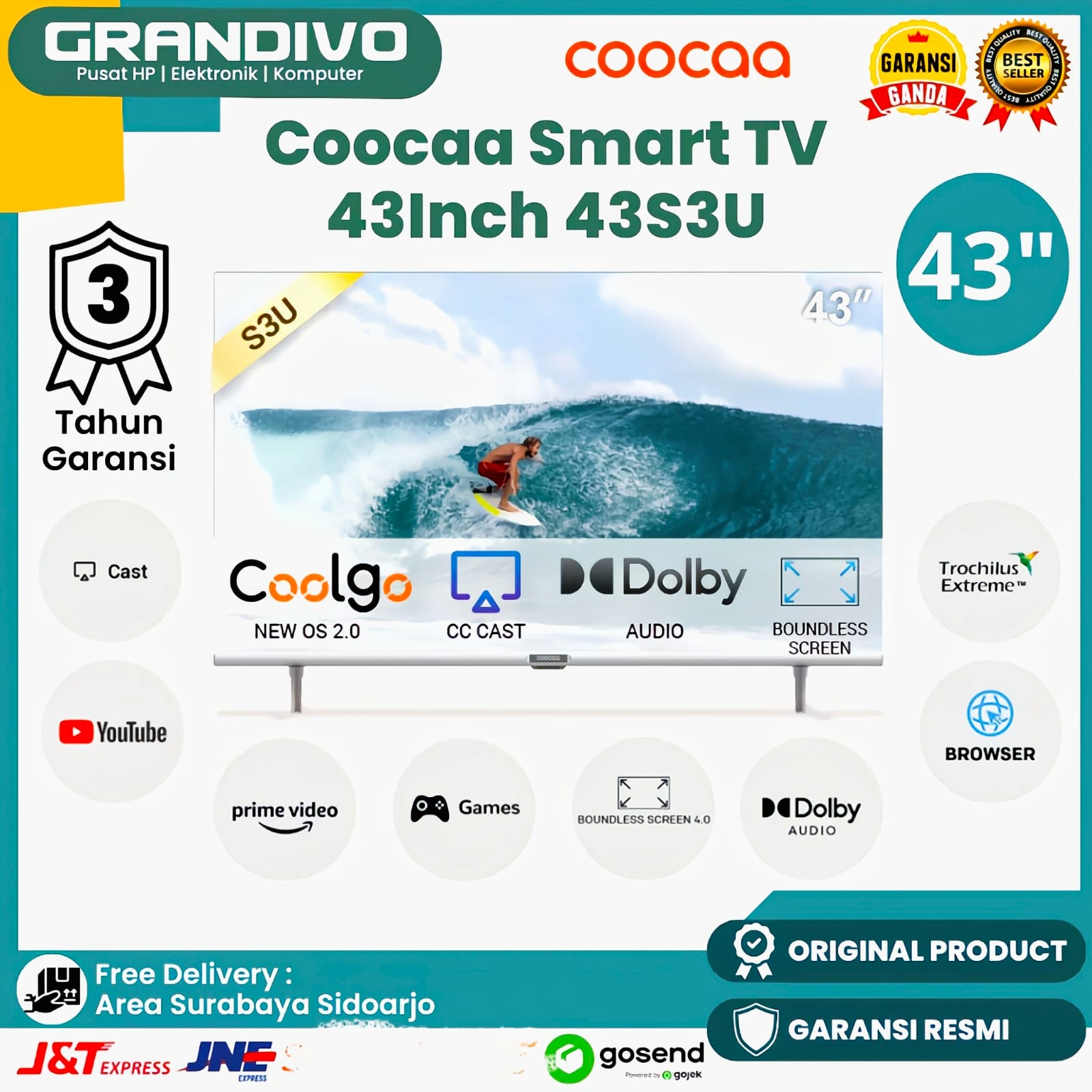 SMART TV LED TV 43 INCH COOCAA 43S3U / 32INCH 32-S3U YOUTUBE GARANSI RESMI - GRANDIVO
