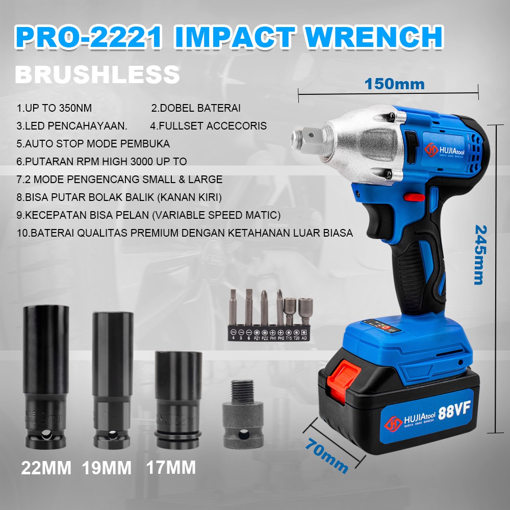 IMPACT WRENCH CORDLESS BRUSHLESS MESIN PEMBUKA BAUT BAN RODA MOBIL HUJIA TYPE PRO 2221 88VF IMPACT WRENCH CORDLESS BATER