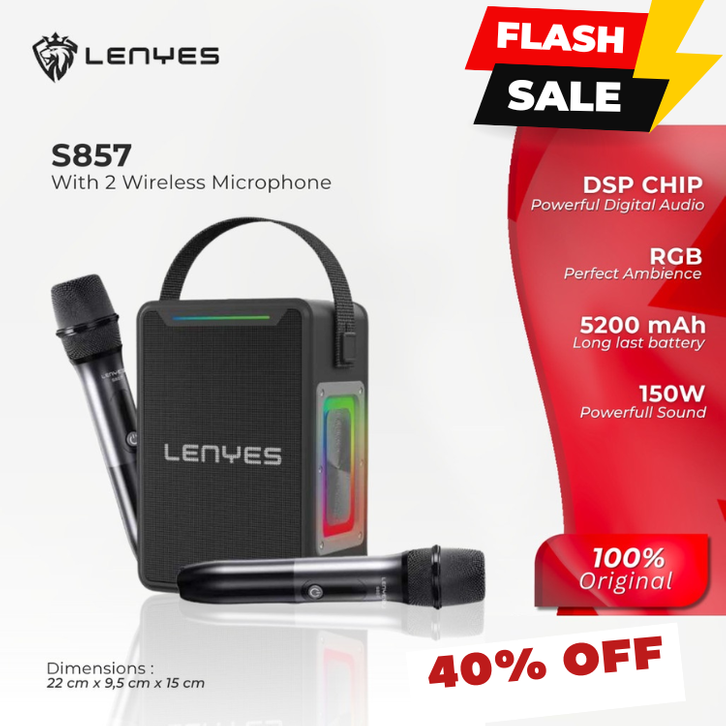 LENYES KARAOKE SPEAKER BLUETOOTH RGB TWS V5.3 150WATT WITH DUAL MICROPHONE HIFI STEREO S857