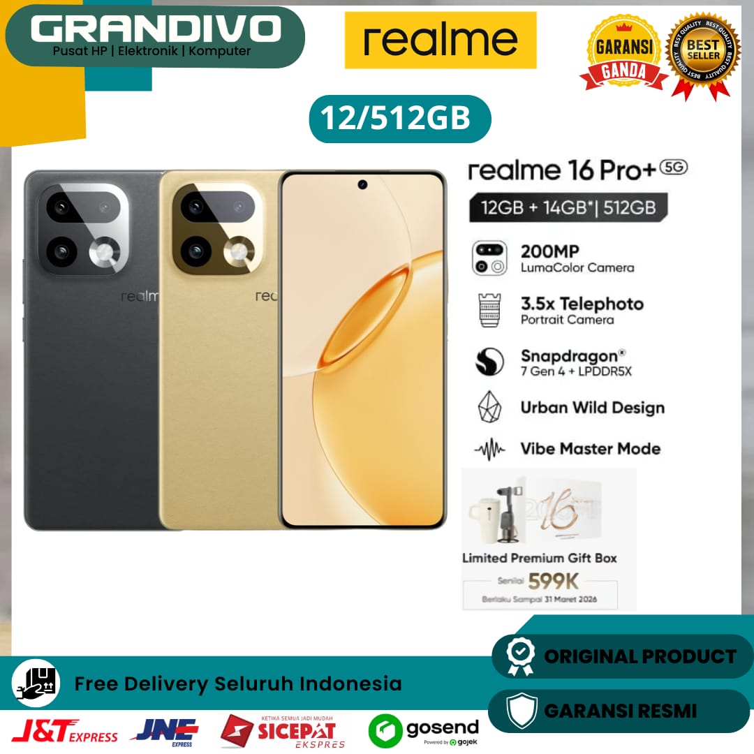Free Gift Realme 16 Pro+ 5G 12/512GB (12GB+14GB Extended RAM) Snapdragon® 7 Gen 4 Chipset Garansi Resmi - Grandivo