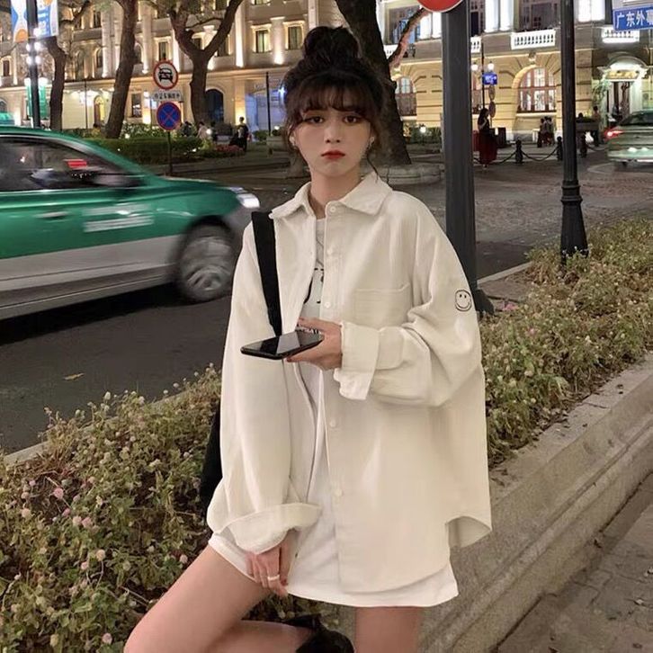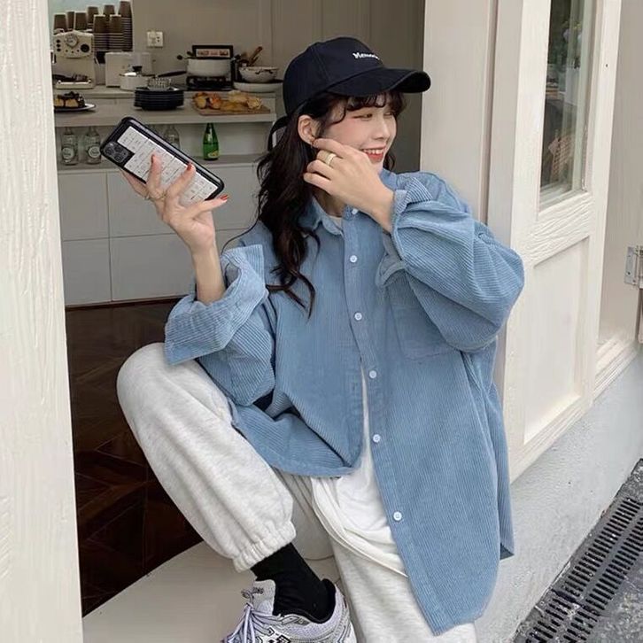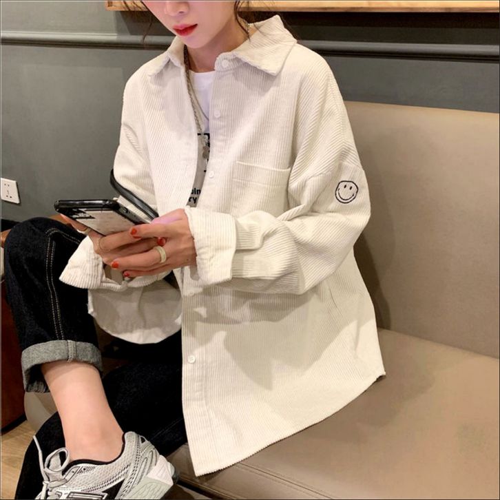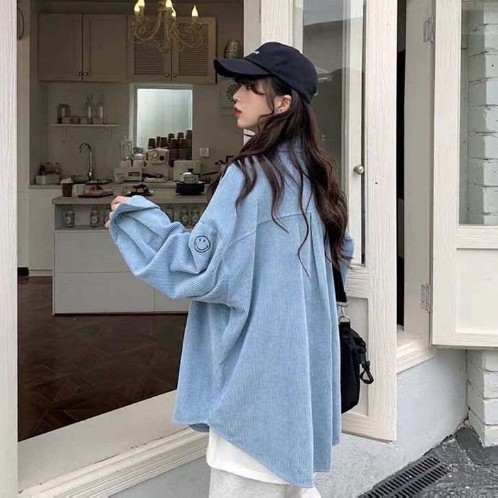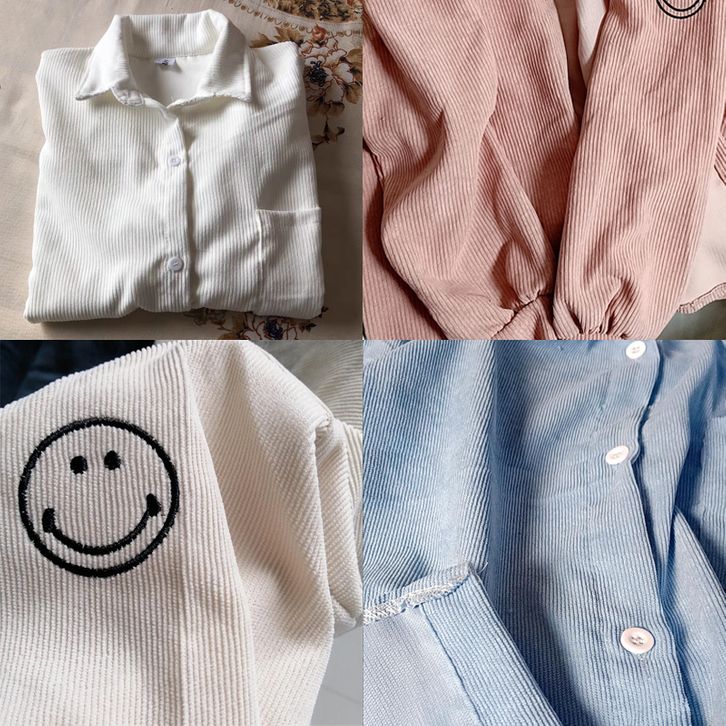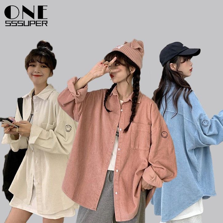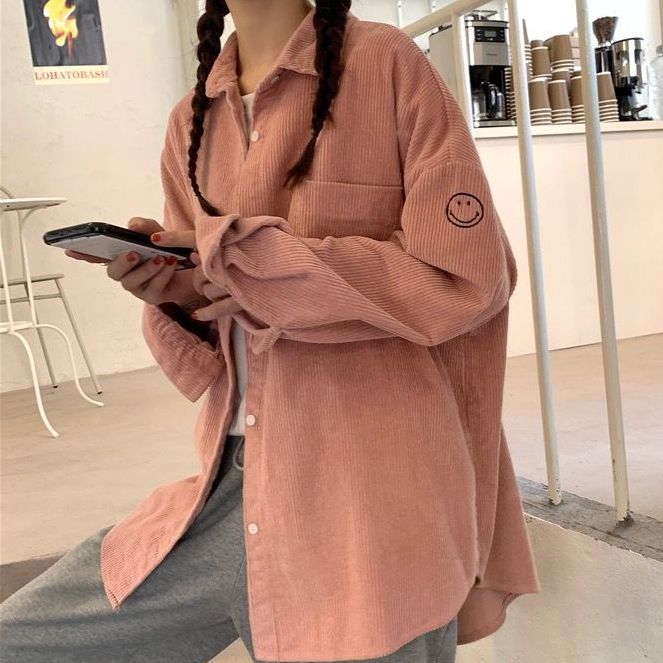 KEMEJA WANITA CORDUROI LENGAN PANJANG ATASAN KORDUROI WARNA POLOS POLA WAJAH TERSENYUM KOREA LONGGAR MANTEL