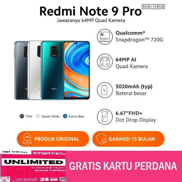 Xiaomi Redmi Note 9 Pro 8/128GB GARANSI 2nd (FREE SIM CARD)