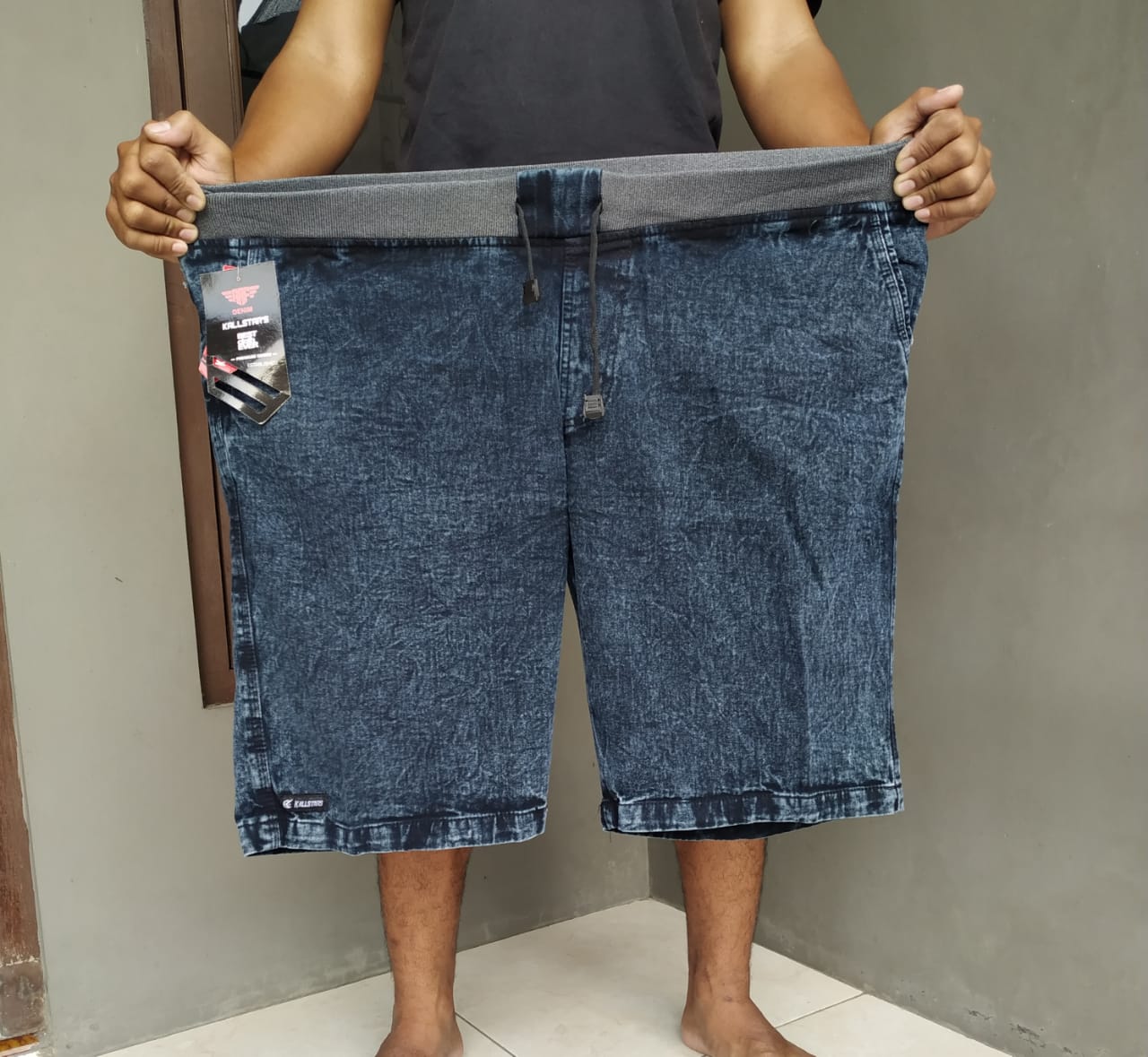 CELANA JEANS PENDEK MODEL RIP DENIM KARET PINGGANG BIG SIZE JUMBO 27-44 MOTIF SNOW BLACK DENIM JEANS PRIA