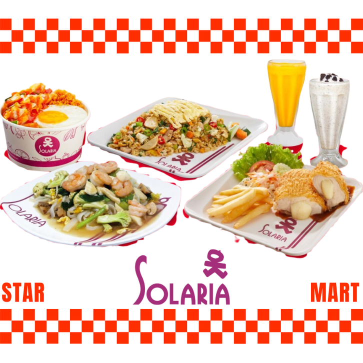 New Family 1, New Family 2, New Family 3, New Family 4, Agustusan 2, BTA 1, BTA 2, Express Bowl Ayam Mentega, Express Bowl Ayam Rica, Express Bowl Ayam Asam Manis, Express Bowl Ayam Mayo, Express Bowl Ayam Teriyaki, Express Bowl Fillet Ikan Teriyaki, Express Bowl Fillet Ikan Mentega, Express Bowl Fillet Ikan Rica, Express Bowl Fillet Ikan Asam Manis, Express Bowl Fillet Ikan Mayo, Express Bowl Mix Mentega, Express Bowl Mix Rica, Express Bowl Mix Asam Manis, Express Bowl Mix Mayo, Express Bowl Mix Teriyaki, Spaghetti Bolognaise, Nasi + Ayam Crispy Black Pepper Sauce, Nasi Crispy Chicken Spicy Mayo, Mie Ayam Teriyaki, Nasi + Ayam Teriyaki, Nasi + Ayam Katsu Teriyaki Saos, Mie + Ayam Katsu Teriyaki Saos, Nasi + Ayam Lada Hitam, Nasi + Chicken Bulgogi, Nasi + Sapo Tahu Ayam, Nasi + Sapo Tahu Sapi, Nasi + Sapo Tahu Seafood, Chicken Cordon Bleu + Nasi & Salad, Chicken Cordon Bleu + French Fries & Salad, Chicken Mozarella + Nasi & Salad, Chicken Mozarella + French Fries & Salad, Chicken Steak Chessy + Nasi & Salad, Chicken Steak Chessy + French Fries & Salad, Fish & Chips + Nasi & Salad, Fish & Chips + French Fries & Salad, Bihun Ayam, Bihun Ayam Bakso, Bihun Ayam Pangsit Rebus, Bihun Ayam Pangsit Rebus Bakso, Bihun Goreng Ayam, Bihun Siram Ayam, Bihun Kuah Ayam, Bihun Goreng Sapi, Bihun Siram Sapi, Bihun Goreng Seafood, Bakso Halus Mie/Bihun, Bakso Ikan Kuah, Pangsit Rebus, Mie Ayam, Mie Ayam Solaria Special ( Pedas ), Mie Ayam Bakso, Mie Ayam Pangsit Rebus, Mie Ayam Pangsit Rebus Bakso, Mie Goreng Ayam, Mie Siram Ayam, Mie Kuah Ayam, Mie Goreng Sapi, Mie Siram Sapi, Mie Goreng Seafood, Kwetiau Ayam, Kwetiau Ayam Bakso, Kwetiau Ayam Pangsit Rebus, Kwetiau Ayam Pangsit Rebus Bakso, Kwetiau Goreng Ayam, Kwetiau Ayam Siram, Kwetiau Masak Ayam, Kwetiau Sapi Goreng, Kwetiau Sapi Siram, Kwetiau Seafood Goreng, Kwetiau Seafood Siram, Nasi Goreng, Nasi Goreng Special, Nasi Goreng Tom Yum Ayam, Smoked Chicken Fried Rice, Nasi Goreng Kambing, Nasi Goreng Bebek Cabe Ijo, Nasi Goreng Sapi Cabe Ijo, Nasi Goreng Modern, Nasi Goreng Petai, Nasi Goreng Sosis, Nasi Goreng Seafood, Nasi Goreng Kepiting, Nasi Goreng Tom Yum Seafood, Nasi Goreng Italy, Nasi Goreng Teri Cabe Ijo, Nasi Goreng Teri Medan, Nasi Cap Cay, Nasi Ayam Cah Jamur, Nasi Ayam Cah Kapri, Nasi Ayam Cah Kembang Kol, Nasi Fu Yung Hai, Nasi Bistik Ayam, Nasi + Ayam Goreng Mentega, Nasi + Ayam Goreng Tepung, Nasi + Ayam Goreng Rica-rica, Nasi + Ayam Nanking, Nasi + Ayam Asam Manis, Nasi Cap Cay Seafood, Nasi + Udang Goreng Tepung, Nasi Bistik Sapi Mentega, Nasi Bistik Sapi Tepung, Nasi + Cumi Goreng Mentega, Nasi + Cumi Goreng Tepung, Nasi + Cumi Goreng Rica-rica, Nasi + Fillet Ikan Goreng Mentega, Nasi + Fillet Ikan Goreng Tepung, Nasi + Fillet Ikan Goreng Rica-rica, Nasi + Fillet Ikan Asam Manis, Lo Mie, I Fu Mie, I Fu Mie Seafood, Nasi Putih, Soup Ayam, Cap Cay Kuah, Telur Dadar, Telur Mata Sapi, Sweet Potato Fried, Fish Ball, Prawn Ball, Spring Roll, Cuttlefish Ball, Crispy Mini Wonton, French Fries, Siomay, Wedges With Bolognaise Sauce, Fish Cake, Chikado, Cookies & Cream Ice Blend, Vanilla Latte Iced Blend, Taro Milk Shake, Teh Tarik, Thai Tea, Es Kopi Malaka, Black Currant, Frozen Capucino, Orange Juice, Juice Alpukat, Juice Melon, Juice Sirsak, Juice Mangga (Musiman), Juice Tomat, Es Jeruk, Milk Shake Strawberry, Milk Shake Chocolate, Milk Shake Vanilla, Milk Shake Blackcurrant, Milo, Es Lemon Tea, Es Lemonade, Melon Lemonade, Lychee Tea, Ice Tea Green, Air Mineral Botol, Es Teh Manis, Teh Manis Panas, Es Teh Tawar, Teh Panas, Es Batu, Kopi Vietnam, Ayam Goreng Mentega, Ayam Goreng Tepung, Ayam Goreng Rica-rica, Ayam Nanking, Ayam Asam Manis, Cumi Goreng Mentega, Cumi Goreng Tepung, Cumi Goreng Rica-rica, Fillet Ikan Goreng Mentega, Fillet Ikan Goreng Tepung, Fillet Ikan Goreng Rica-rica, Fillet Ikan Asam Manis, Udang Goreng Tepung, Bistik Ayam, Bistik Sapi Mentega, Bistik Sapi Tepung, Ayam Cah Jamur, Ayam Cah Kapri, Ayam Cah Kembang Kol, Fu Yung Hai, Cap Cay Seafood, Cap Cay Goreng, Paket Family Suka Suka Bisa Req 3 menu