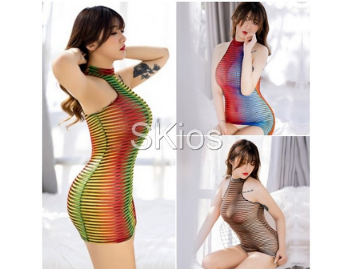 DM - Sexy Lingerie Transparan Color Striped High Neck Dress Ketat Baju Tidur Wanita L344