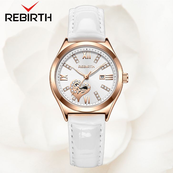 REBIRTH Jam Tangan Wanita Tahan Air Berbentuk Hati Berlian Kuarsa Calendar Tali Kulit Mewah Jam Tangan Cewek RE2028