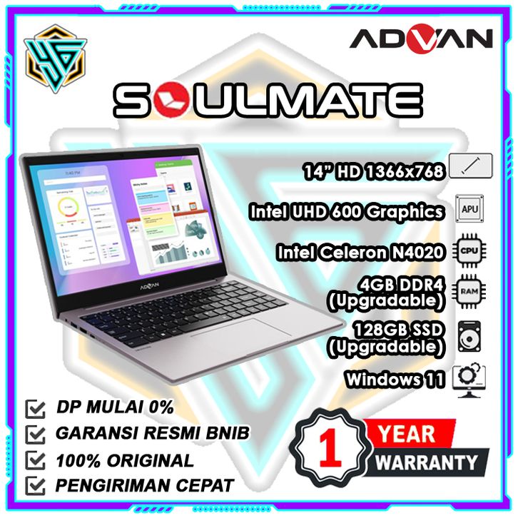[ BEST SELLING DP 0 🔥 ] LAPTOP ADVAN Soulmate Celeron N4020 4GB/128GB (upgradable) 14" HD - WINDOWS - GARANSI RESM