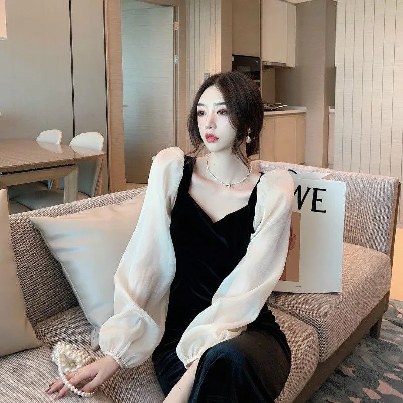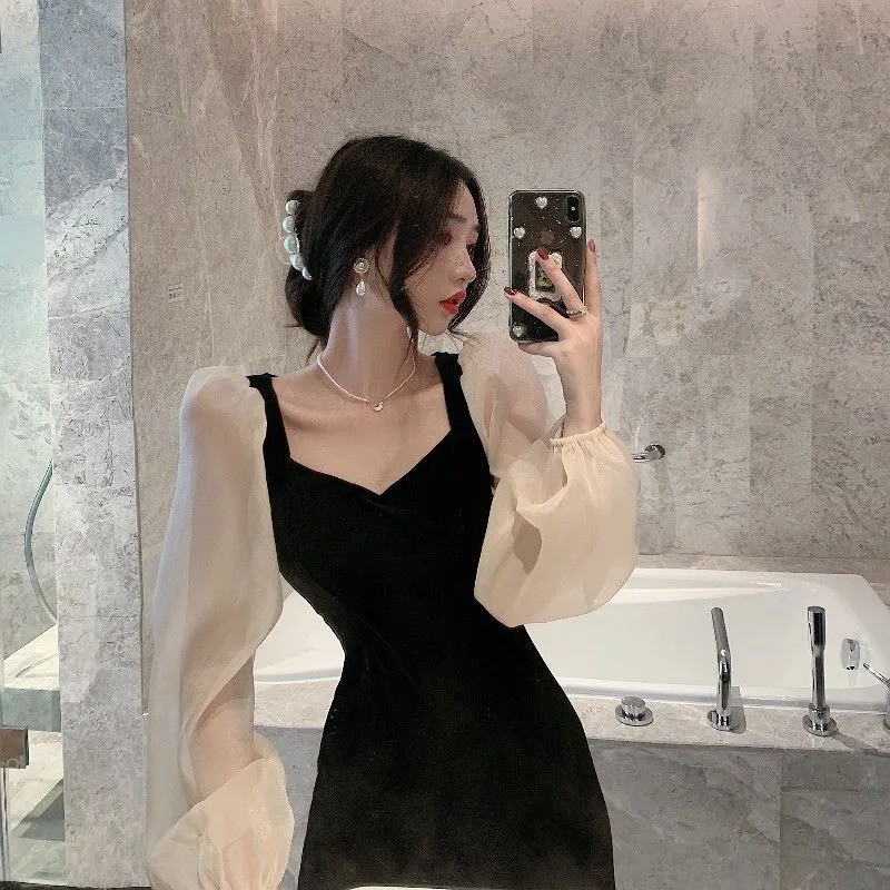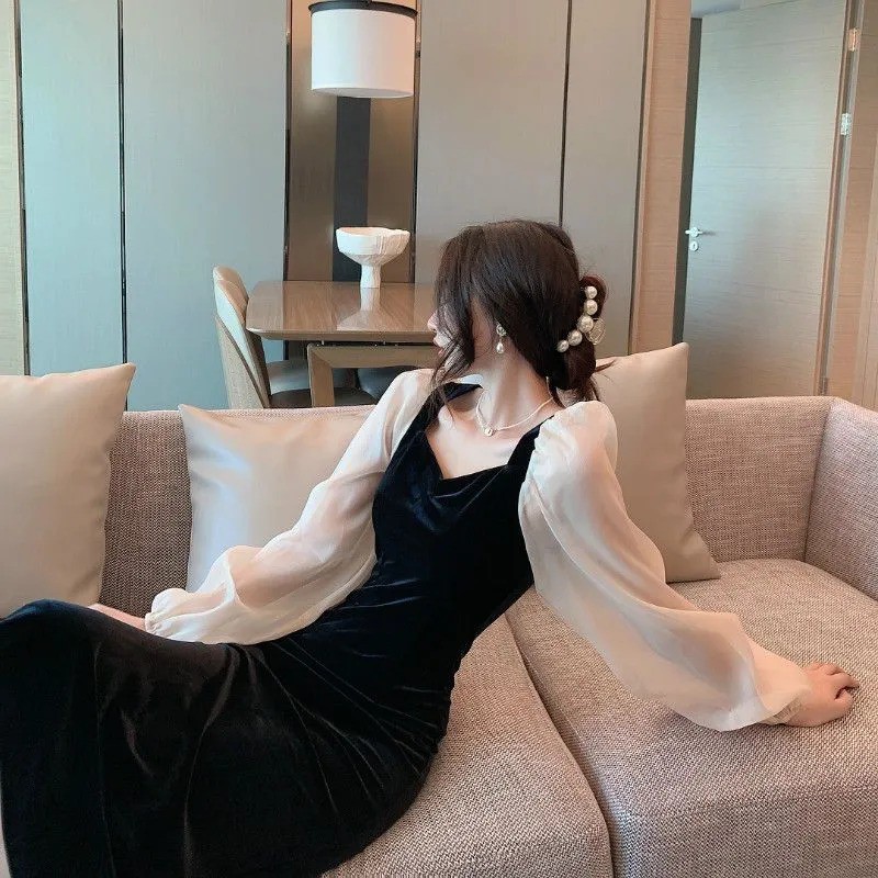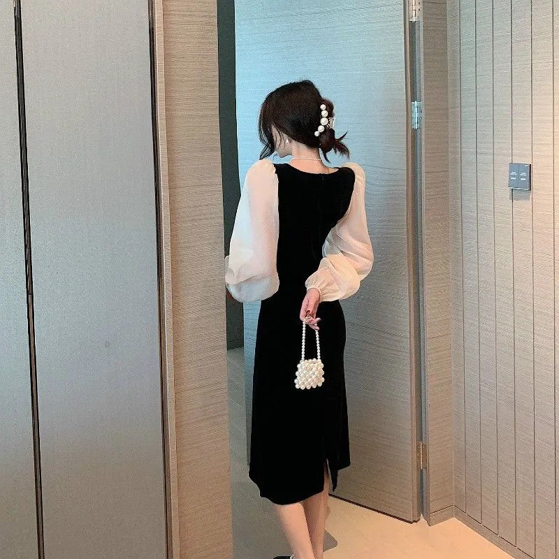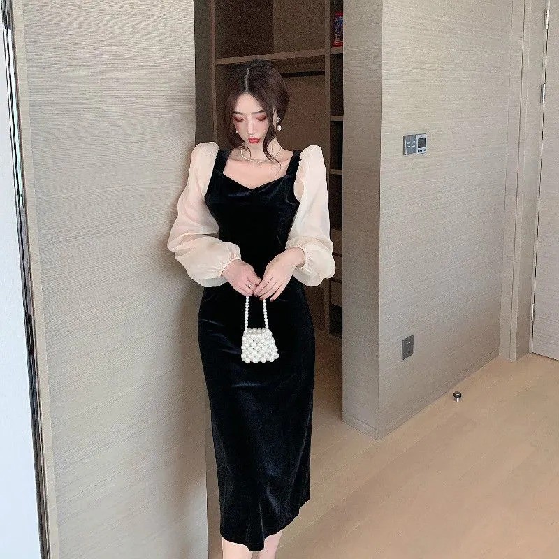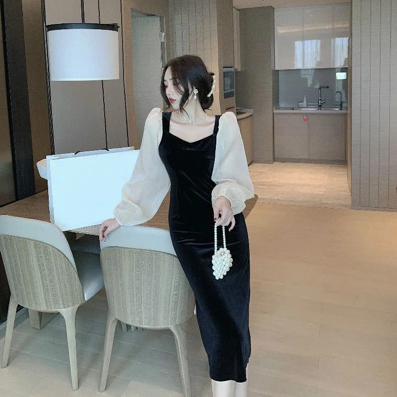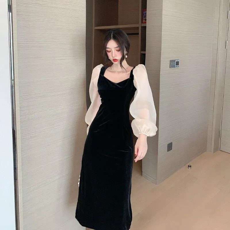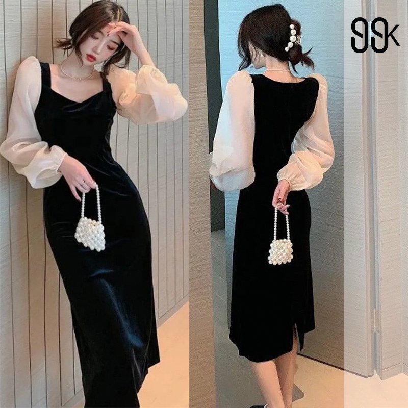 Long Sleeve Velvet Midi Party Dress Wanita Beludru 1173 (S/M/L)