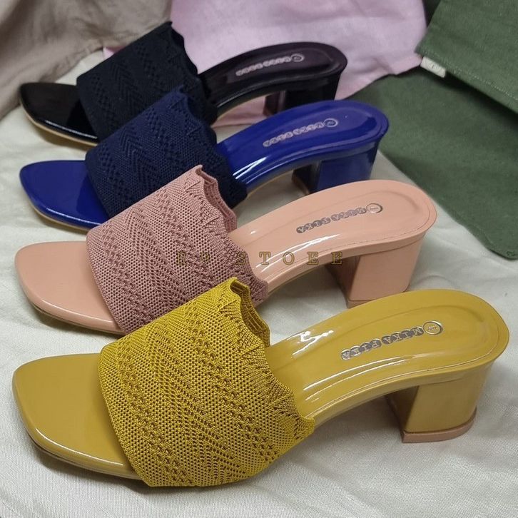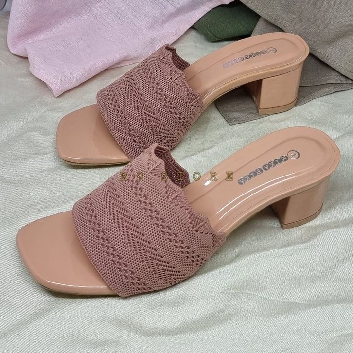 R9 sepatu pesta wanita Selop Rajut Hak Tahu 5 CM Heels Import