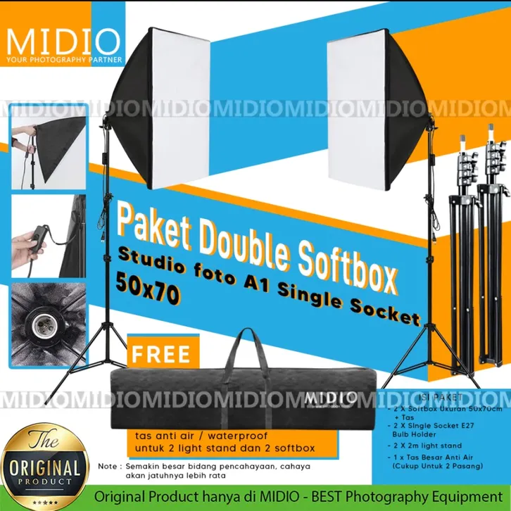 PAKET DOUBLE SOFTBOX MIDIO A1 LIGHT STAND 2M + 1 SOCKET E27 + SOFBOX PAKET STUDIO PHOTO 1SET FREE TAS BEST SELLER
