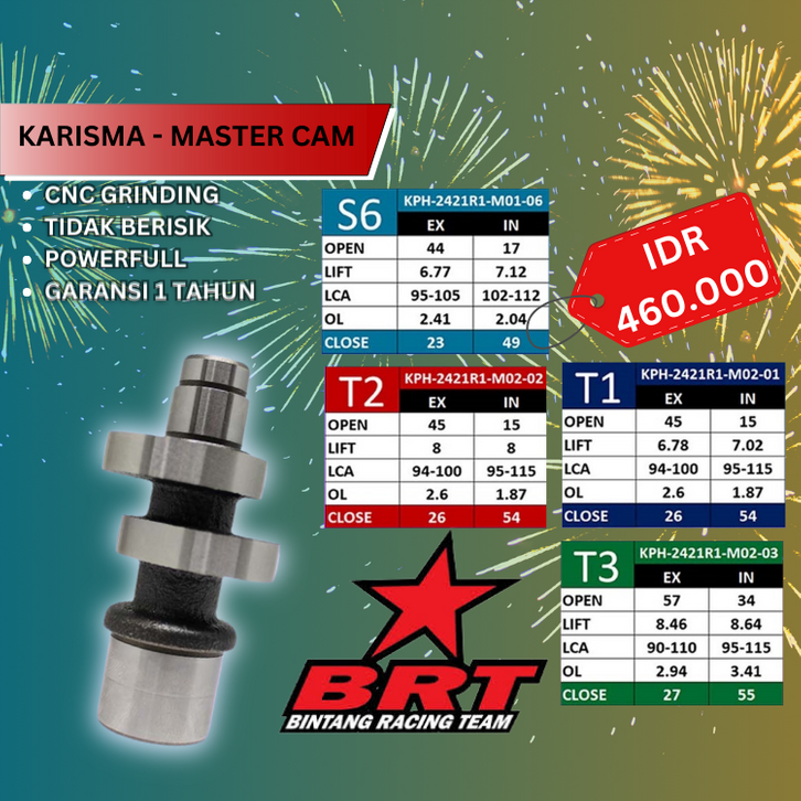 MASTER NOKEN AS BRT 2102 SUPRA X 125 KARISMA KIRANA, MASTER CAM RACING CAMSHAFT S6 T1 T2 T3 MESIN STANDAR/BORE UP/KOMPET
