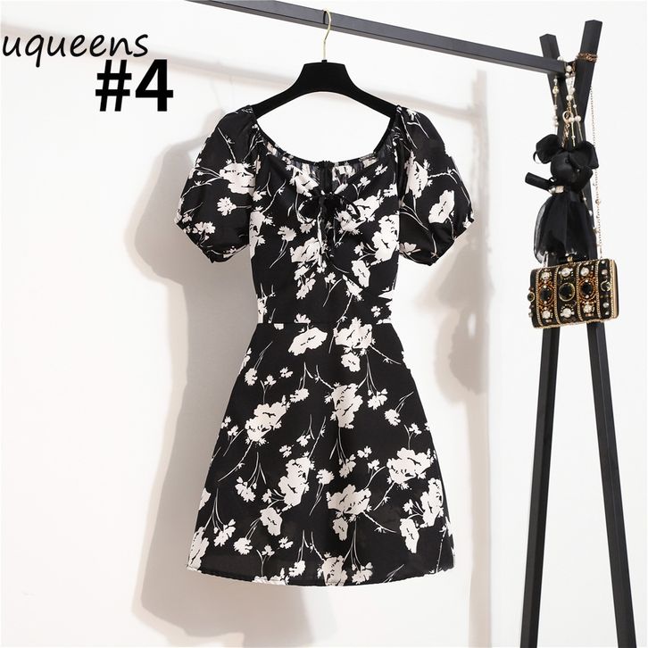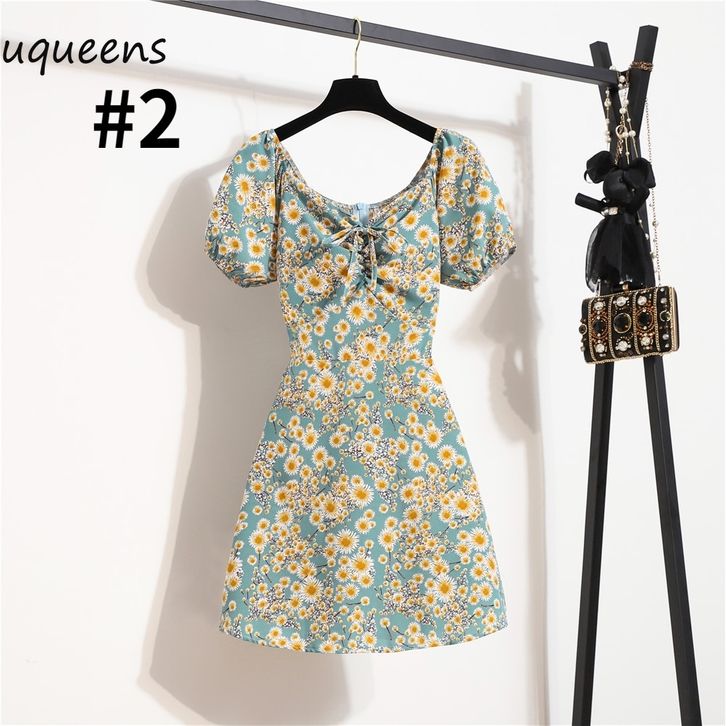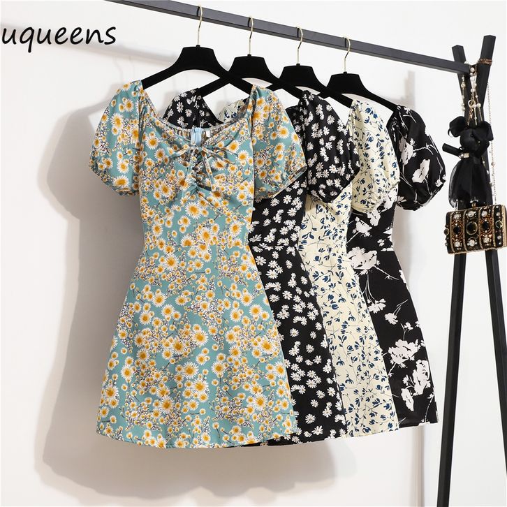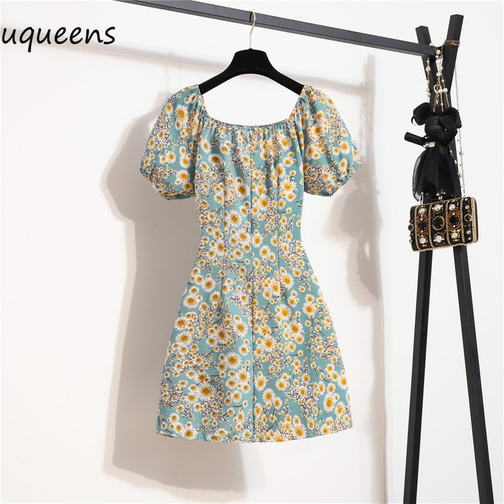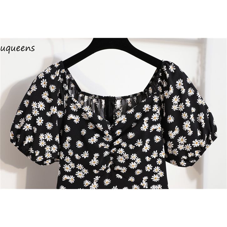 Gratis Ongkir Dress Bunga Lengan Pendek V-Neck Wanita dengan Sablon Bunga Daisy, Baju Pesta, Gaun Party, Dres Vintage