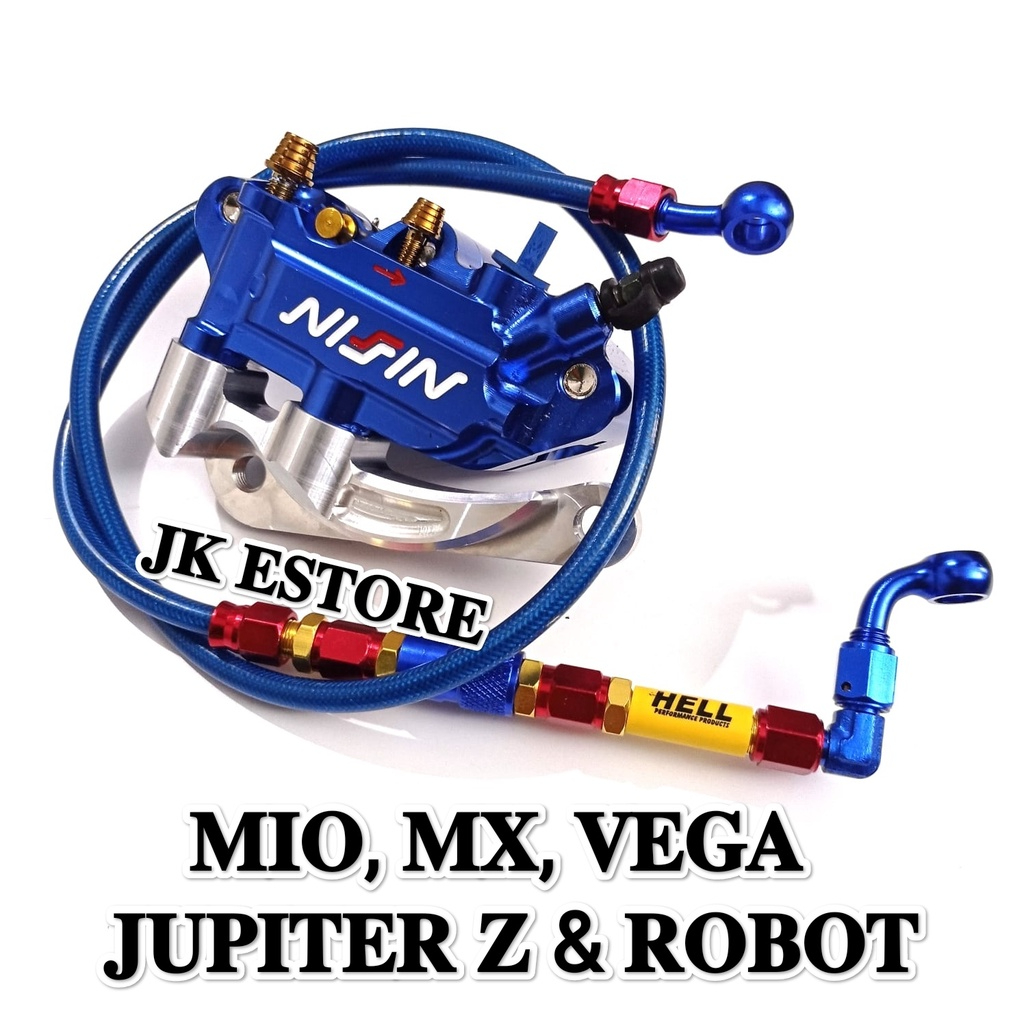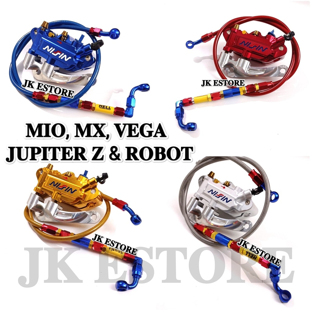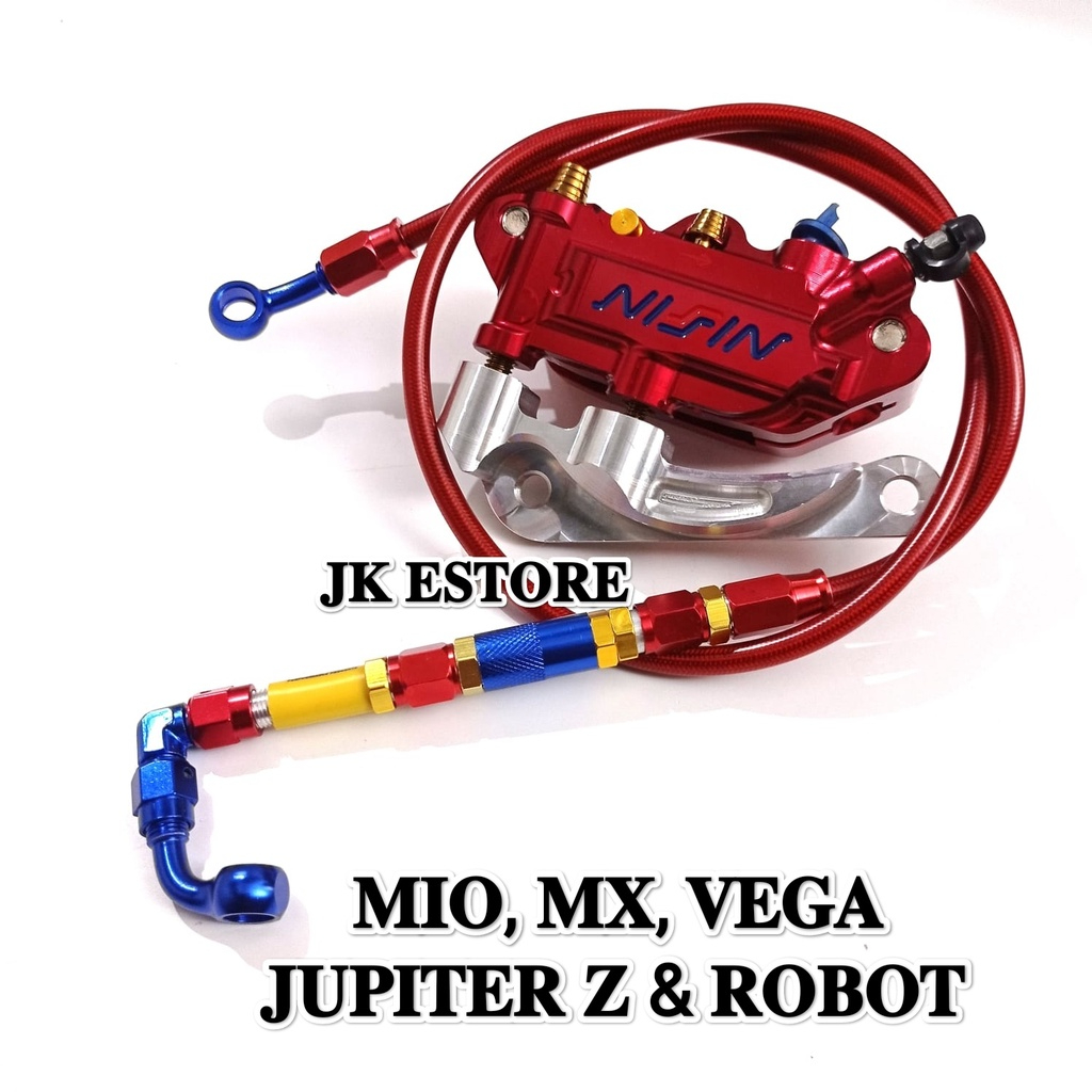 PAKET KALIPER MONOBLOK NISSIN 4 PISTON + SELANG REM DEPAN 90CM + BANJO BENGKOK + BREKET MIO MX VEGA JUPITER Z JUPITER RO