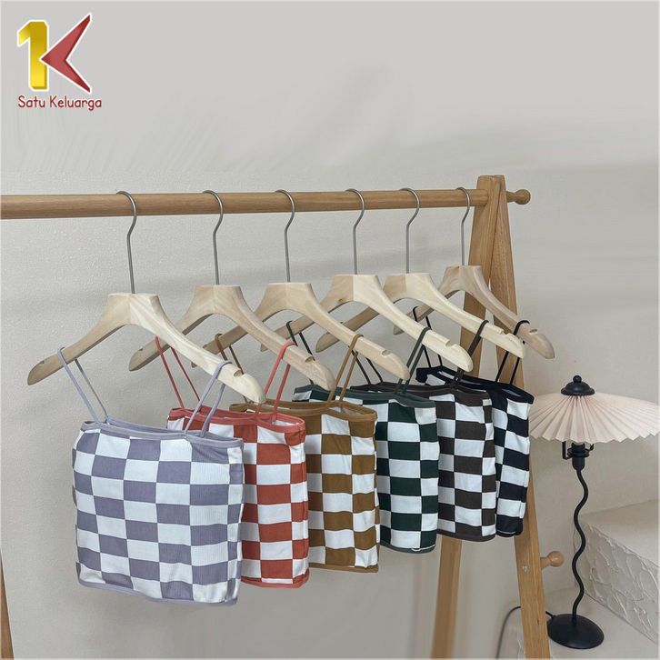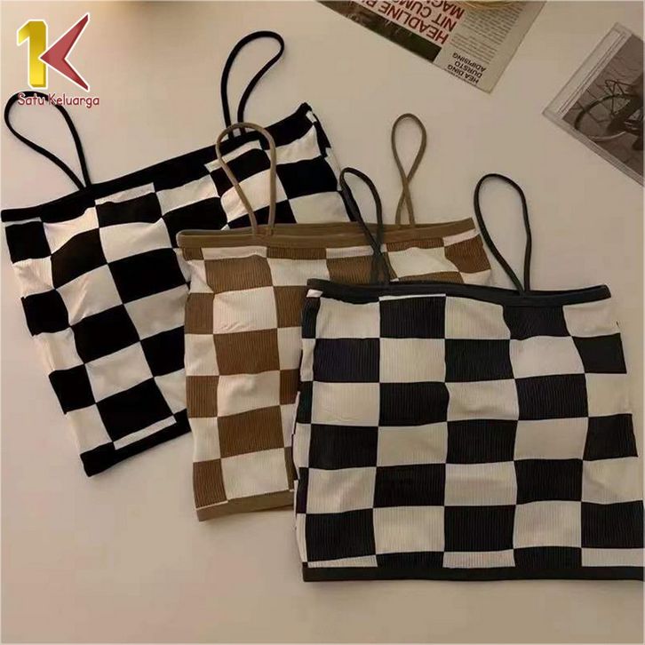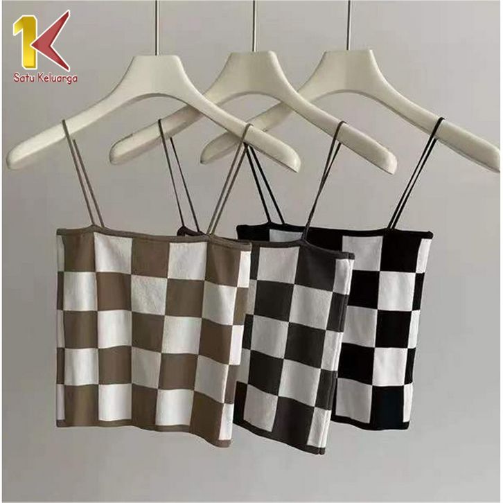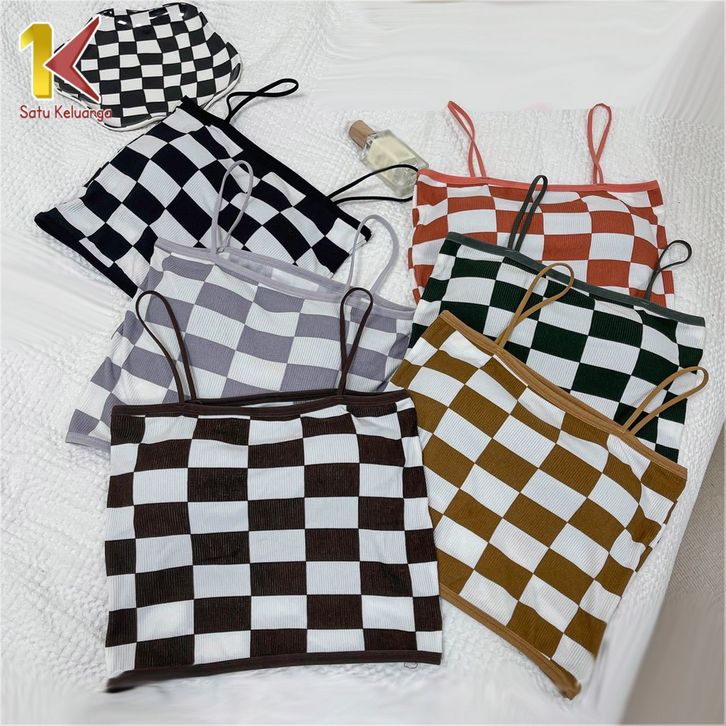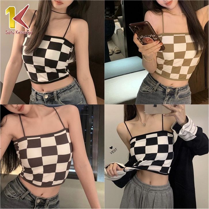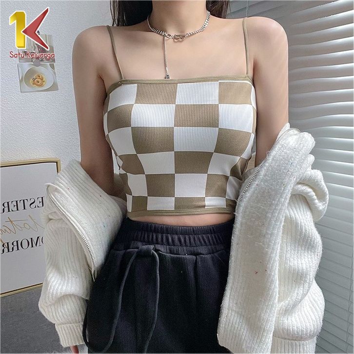 Tanktop Wanita Motif Catur Kotak-Kotak Tanpa Lengan Crop Top Tengtop Atasan Wanita Bahan Rajut 1K P199