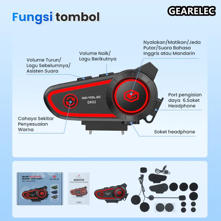 Intercom Gearelec DK02 BT5.2 Helm Sepeda Motor Bluetooth Headset Hands Free Call Kit IPX7 Tahan Air 2800mAh