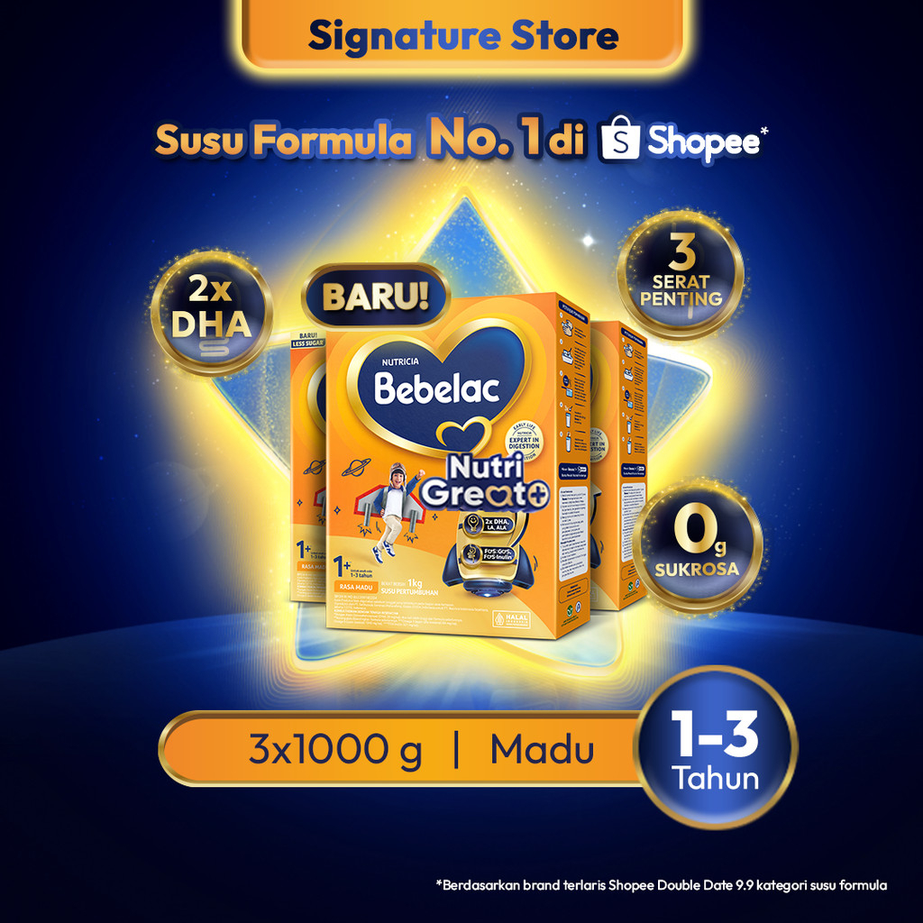 Bebelac 1+ (1-3 Tahun) Madu/Vanilla 3x1000 gr Susu Pertumbuhan Bubuk