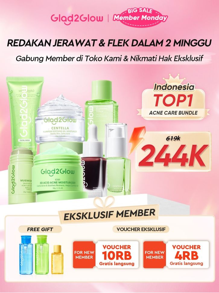 [ORDER NOW, HEMAT 50K]Glad2Glow Acne Jerawat Bundle 7in1 paket Centella madeca cream-Moisturizer+Serum+Cleanser+Toner+Cl