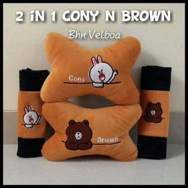 Bantal Set Mobil 2 in 1 / Headrest Car Set 2in1 Lucu Coklat