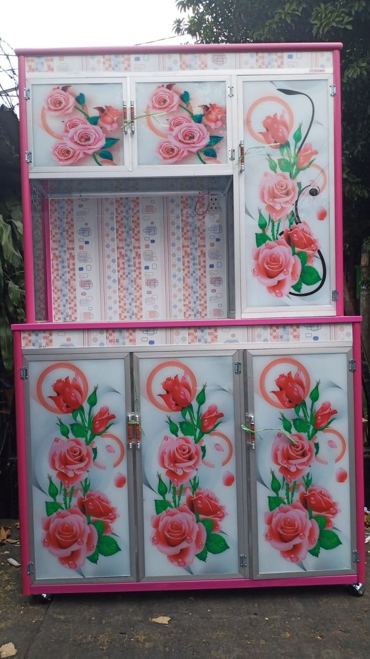 Rak Piring Kaca Lukis 3 Pintu Gendong Bunga Roda THB Alas Keramik