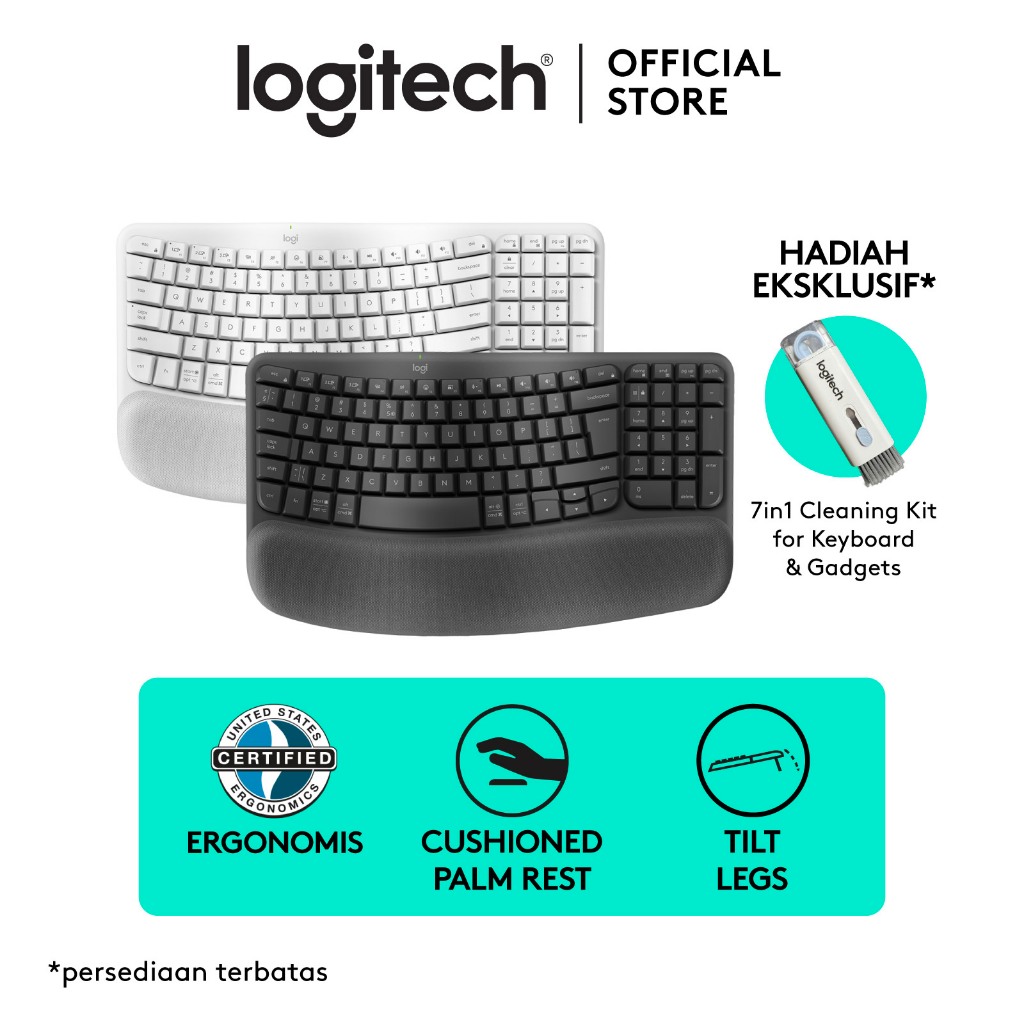 Logitech Wave Keys Keyboard Ergonomis Wireless, Bluetooth dan Multi-OS Windows/ Mac dilengkapi dengan Cushioned Palm Res