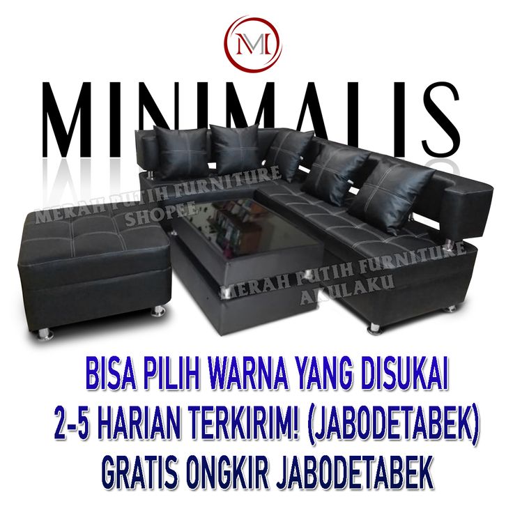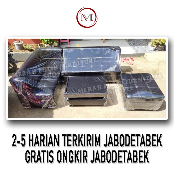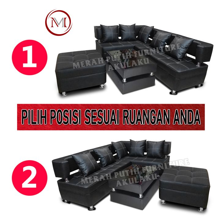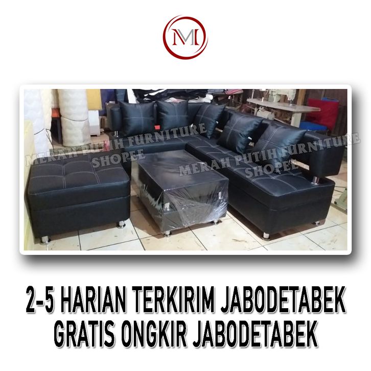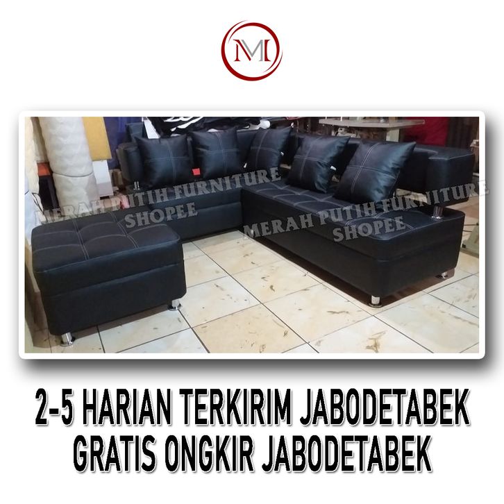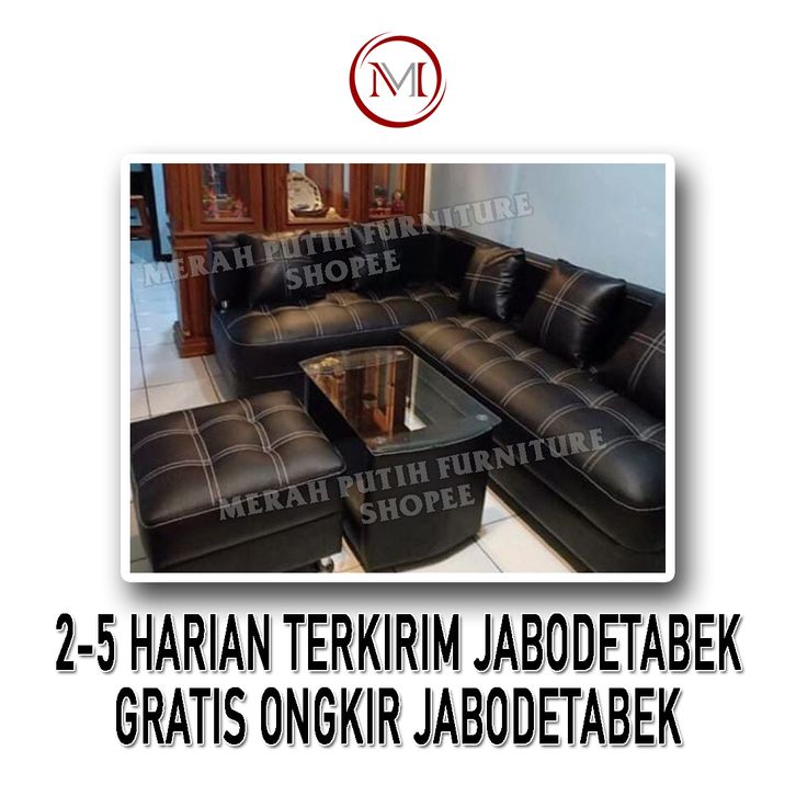 Sofa Ruang Tamu L Sudut Black Tiger + Meja + Stool Jumbo | Minimalis - Murah - Mewah | Hitam - Kulit Oscar