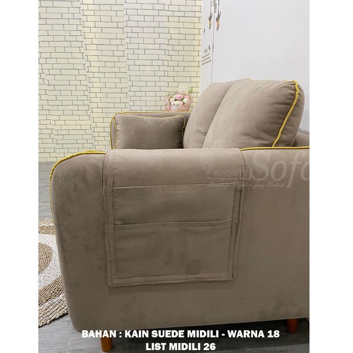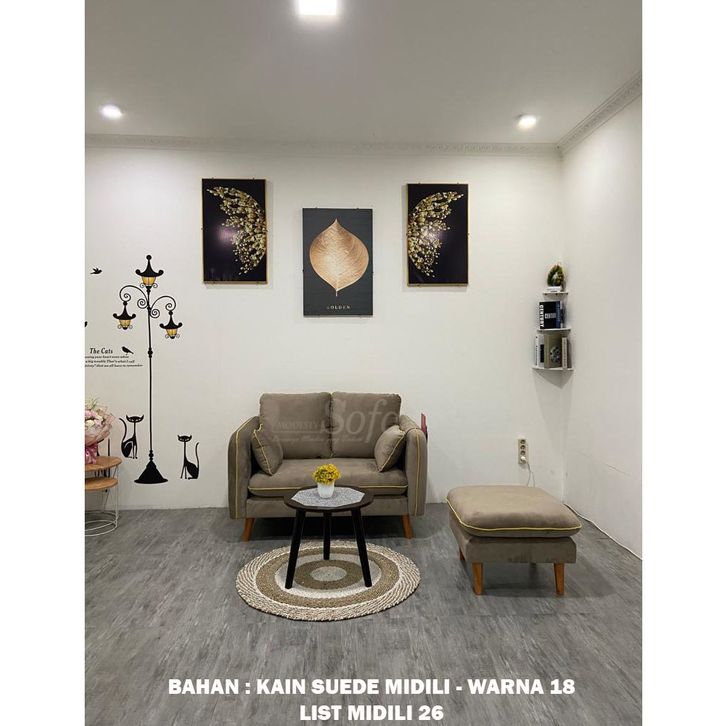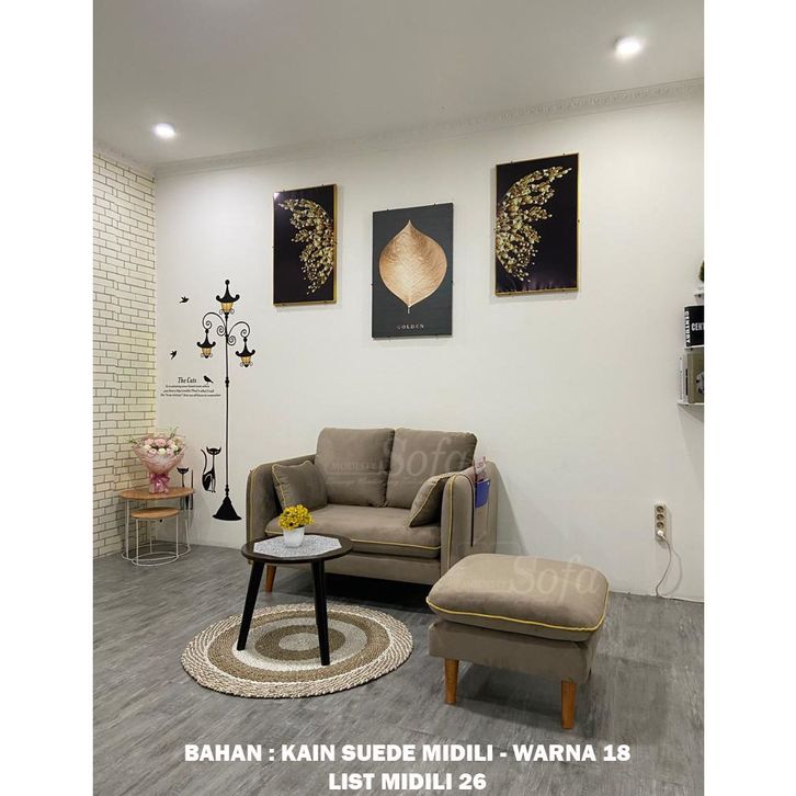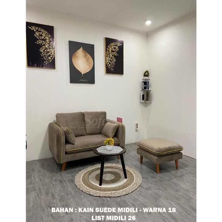 Sofa Ruang Tamu Modesty 2 Seater Puff Kotak Flat - List + Meja Retro Bulat
