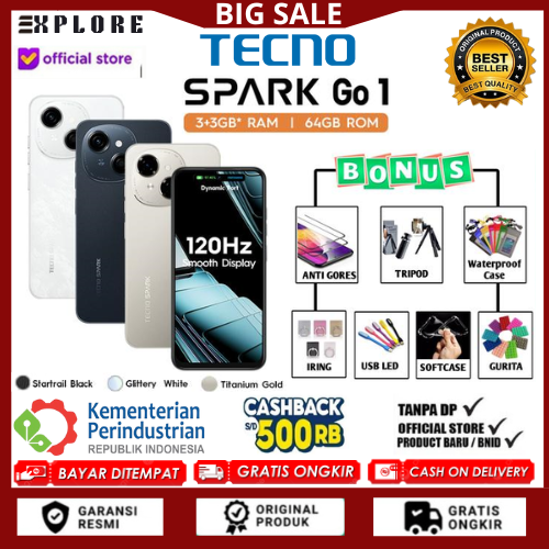 official store 🔥 TECNO SPARK Go 1 – 8GB*+128GB, 120Hz Display, T615+4.5G Network, 5000mAh+15W, IP54, Android 14 RESMI