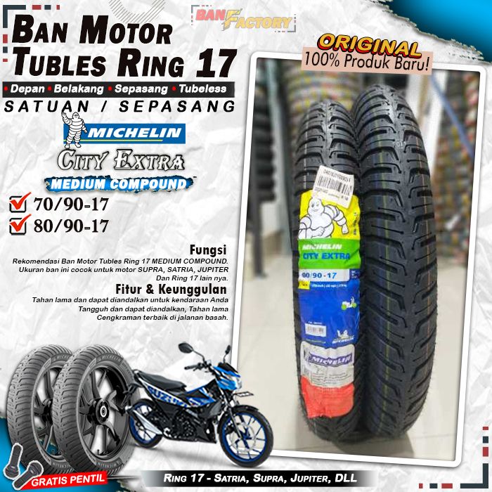 Ban Motor Tubles Depan Belakang Ninja Vixion Supra Satria Jupiter Michelin City Extra Ring 17 Tubles Tubeless