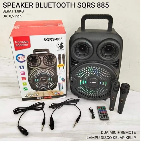 Speaker Bluetooth SQRS 885 Karaoke Full Bass Free 2 Mic 8 Inchi Radio Fm Mp3