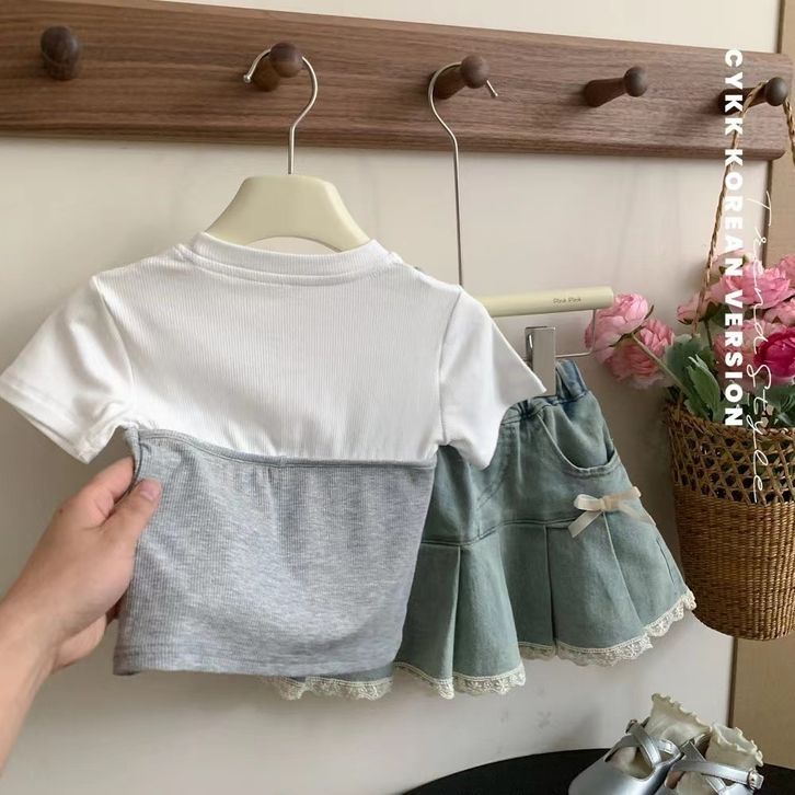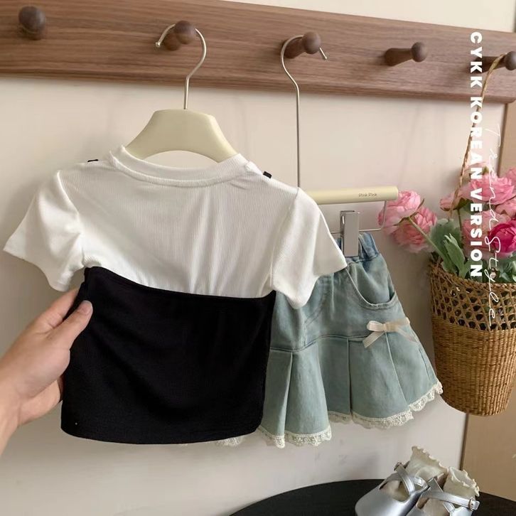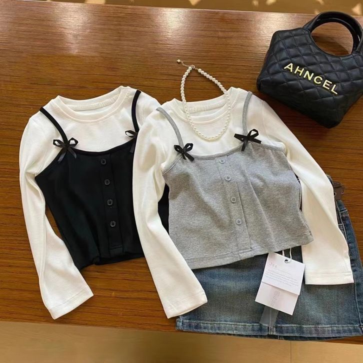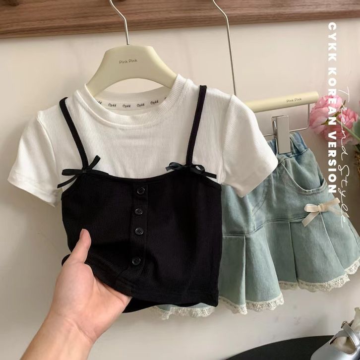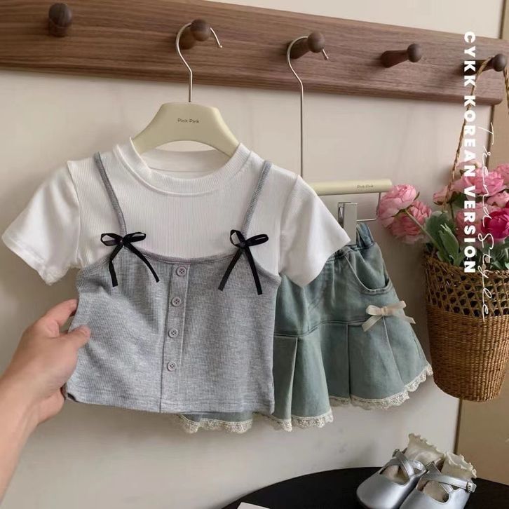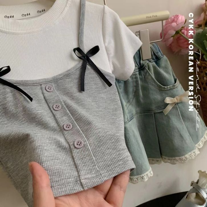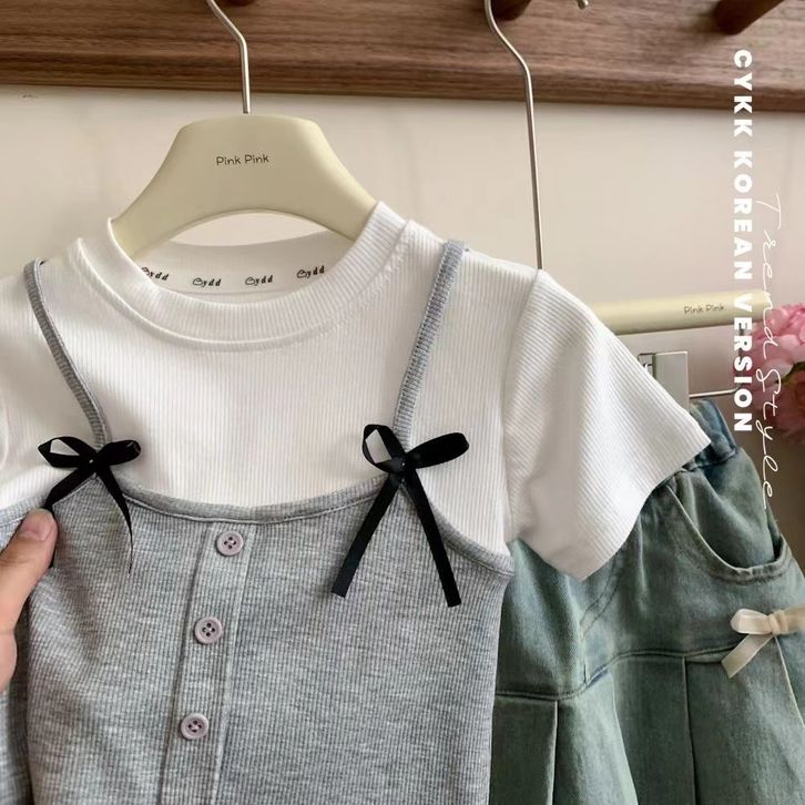 Atasan lengan pendek pita katun anak perempuan Korea yang baru 2 3 4 5 6 7 8 9 10 Tahun
