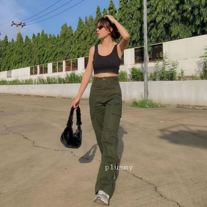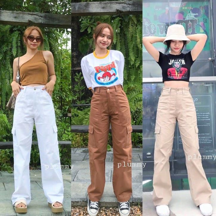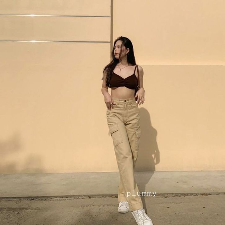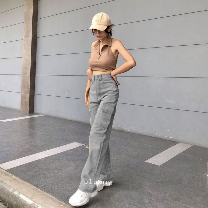 CELANA CARGO CEWEK JINS KIMPUL HIGHWAIST LOOSE CREAM LATTE CHOCO TERBARU - CELANA CARGO WANITA 100% ORI