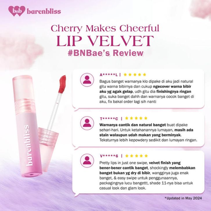 BNB barenbliss Cherry Makes Cheerful Lip Velvet korea Lipcream / KHALISA STORE / SKINCARE MAKEUP ORIGINAL / SET PAKET /