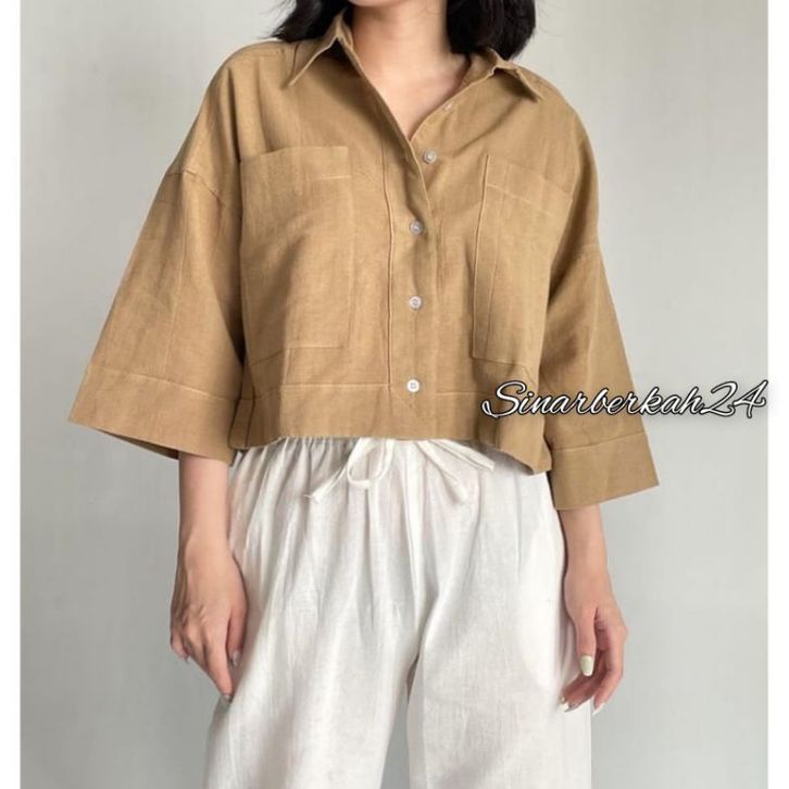 Kemeja Crop Linen Pocket Outer Oversized Shirt Atasan