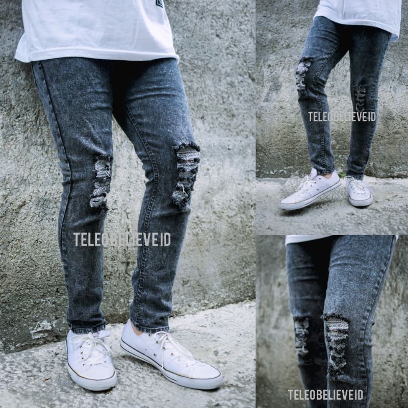 CELANA JEANS PRIA SOBEK LUTUT 28-33 ROBEK LIGTH SNOW BLACK
