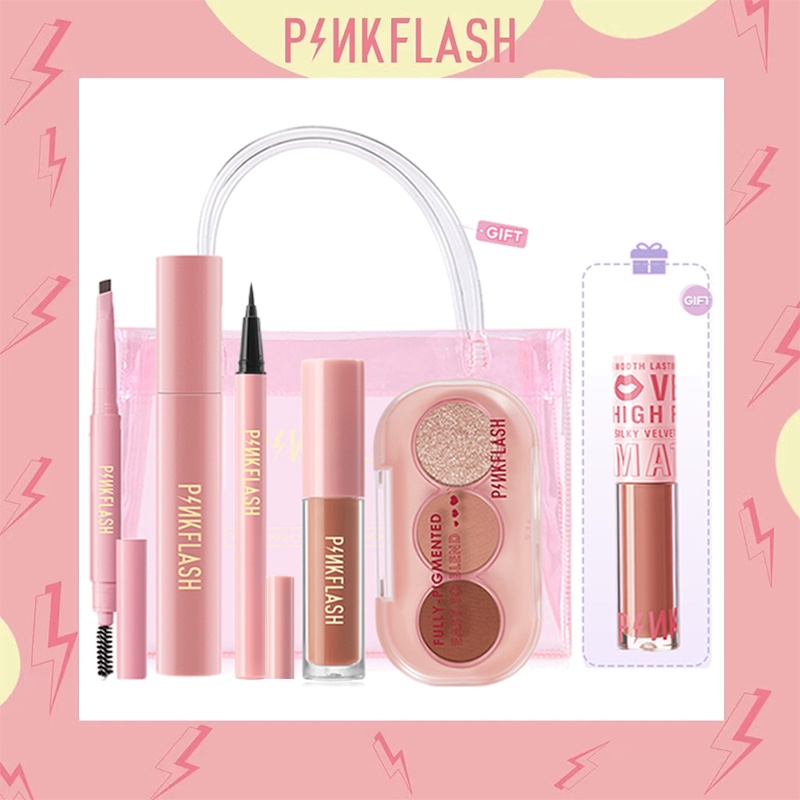 PINKFLASH Eye Makeup Set 3 Shades Eyeshadow Matte Liqui d Lipstik Ombrelips Tahanair Tahan lama Eyebrow Eyeliner Mascara