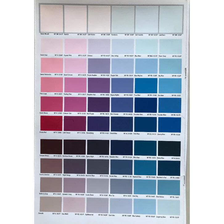 Putih 1505, Lily White 1509, Barley White 1515, Lime Green 1546, Green Freeway 1540, Victoria 1523, Atlantic 1541, Candy Pink 1562, Lavender Print 1553, Blue Beauty 1526, Marina 1534, Swimming Blue 1547, Jasmine 1525, Sunshine 1557, Lilac Dream 1559, Cream 1518, Sand Storm 1560, Cafe Latte 1556, Extra White 1501, Blue White 1503, Durian 1514, Sunset 1516, Hitam 1519, Tropical Grey 1522, Fresh Green 1524, Hijau Telor 1154, Ivory 1117, Moon Glow 1671, Bright Green 1657, Soft White 1529, Baby Baby 1558, Happy Fuschia 1554, Peace Blue 1555, Orange Torch 1131, Chiffon 1561, Tangerine 1532, Graycloth 1550, Lakestone 1539, Copper Grey 1549, Stone Grey 1548, Pink Posy 1552, Clear Sky 1690, Real Morado 1688, GLDN Honey 1691, Lemon 1684, Hijau Bolu Pandan, Sky Blue 1533, Hisbiscus