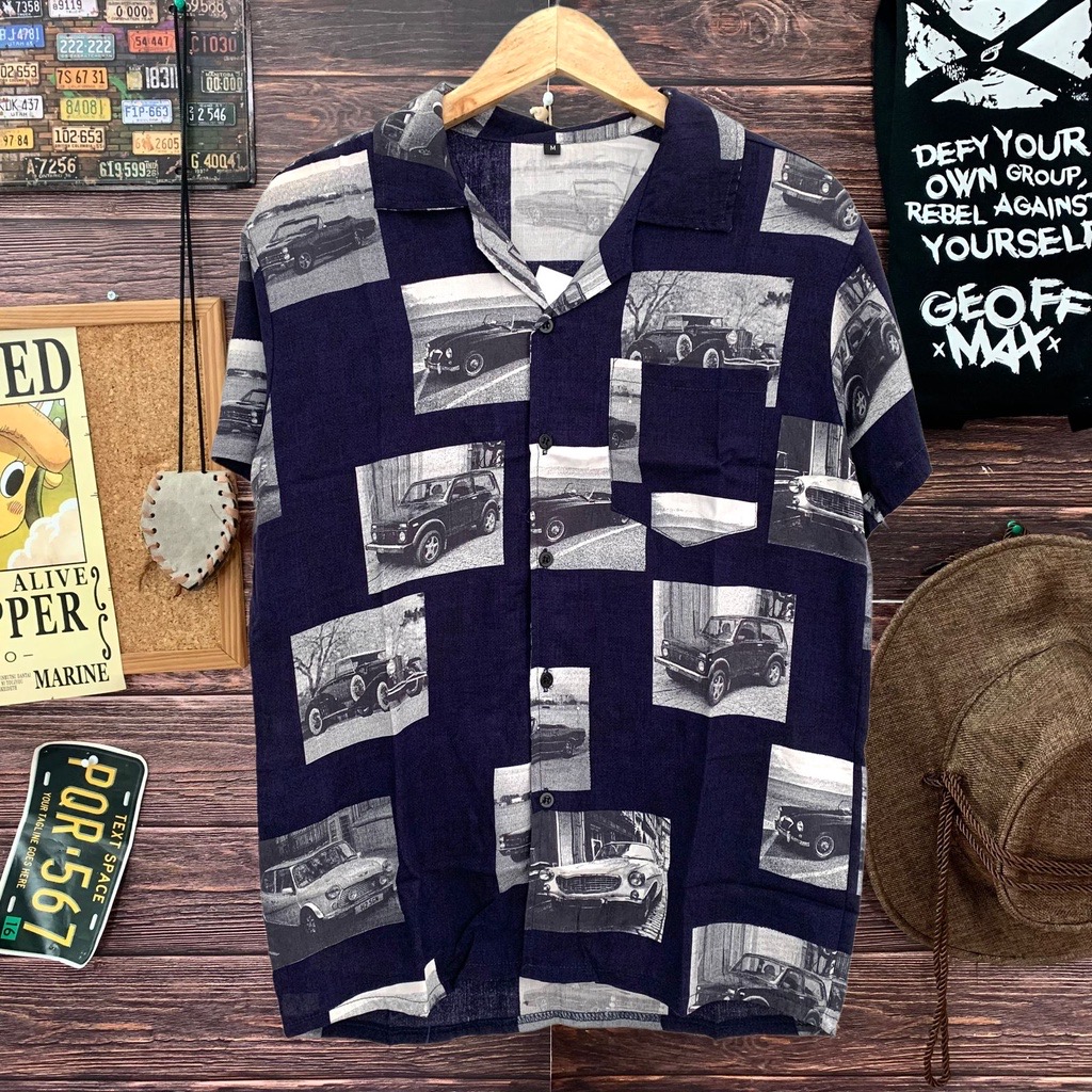 kemeja distro kemeja pria motif car bahan rayon ready size M L XL kemeja cowok