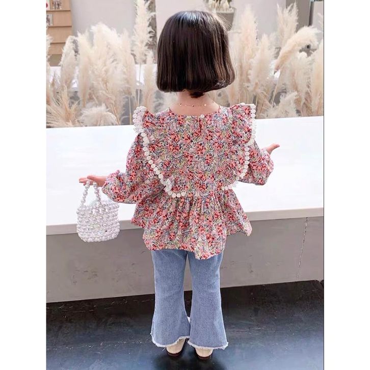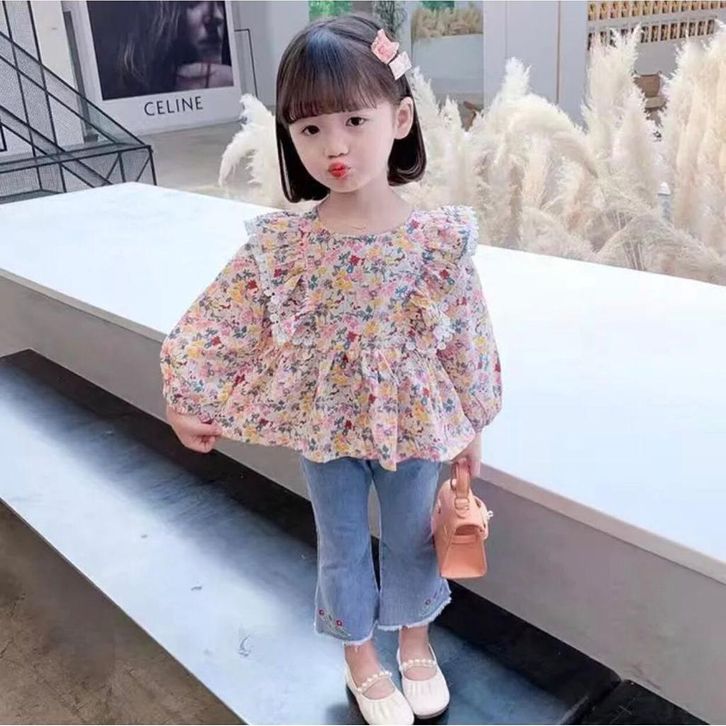 SET GIRLS IMPORT BAJU STELAN ANAK PEREMPUAN CEWEK LENGAN PANJANG MOTIF BUNGA CELANA JEANS PANJANG