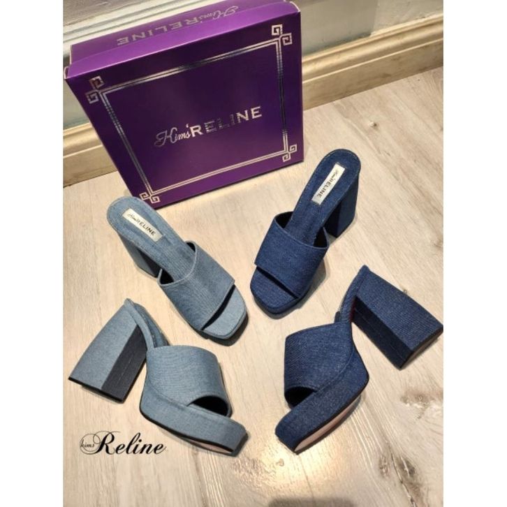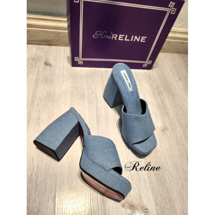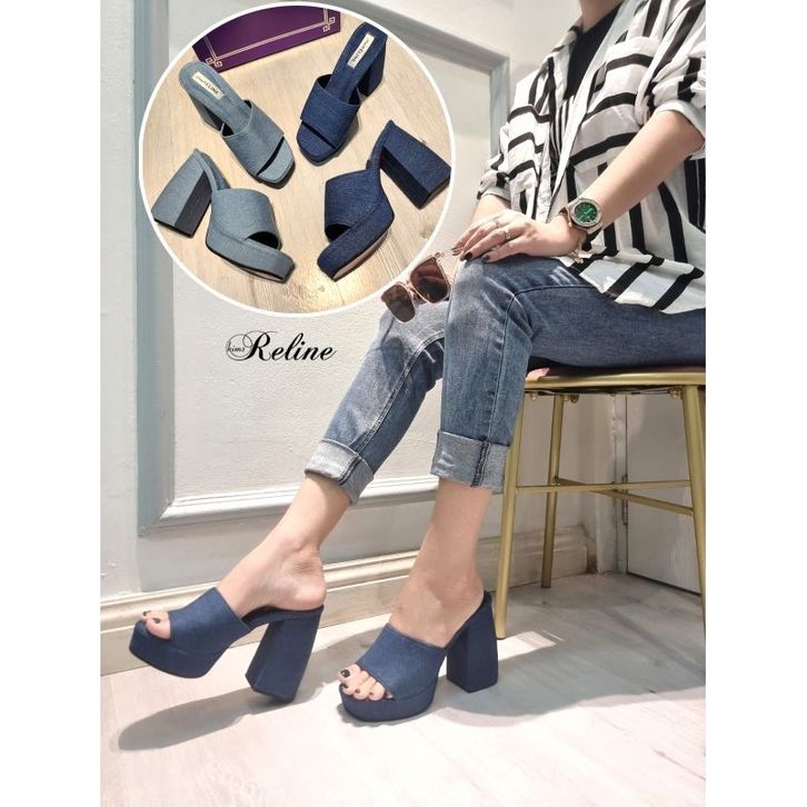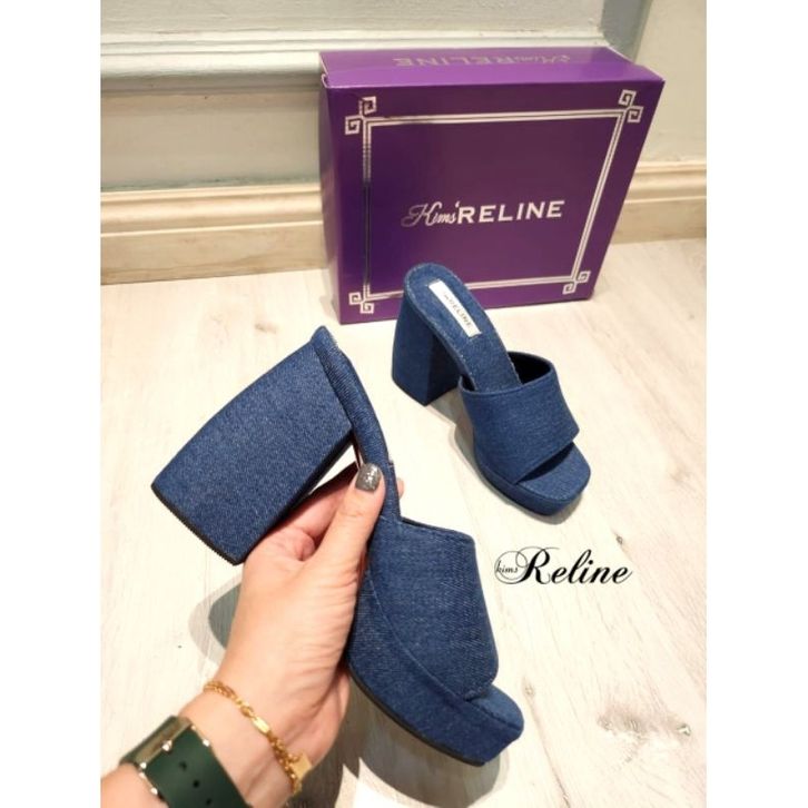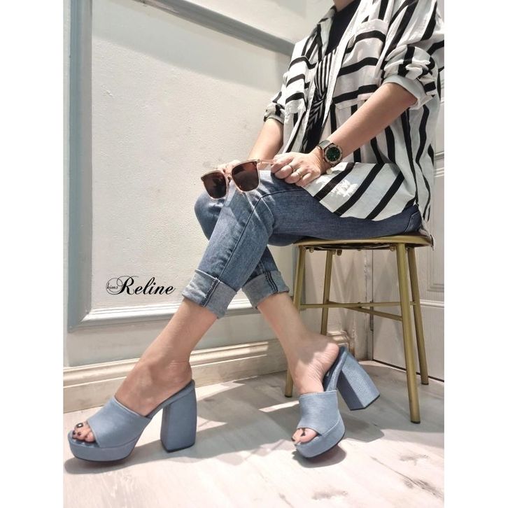 FREE ONGKIR SANDAL WANITA HEELS RELINE 3113 JEANS DENIM CHUNKY HAK BAKPAU TINGGI 9CM