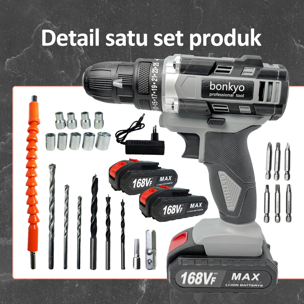Bonkyo 168VF Mesin Bor Impact Drill / Bor baterai /Bor Listrik/Beton Besi Kayu Full Set Pilihan Bor Tanpa Kabel Bor bate