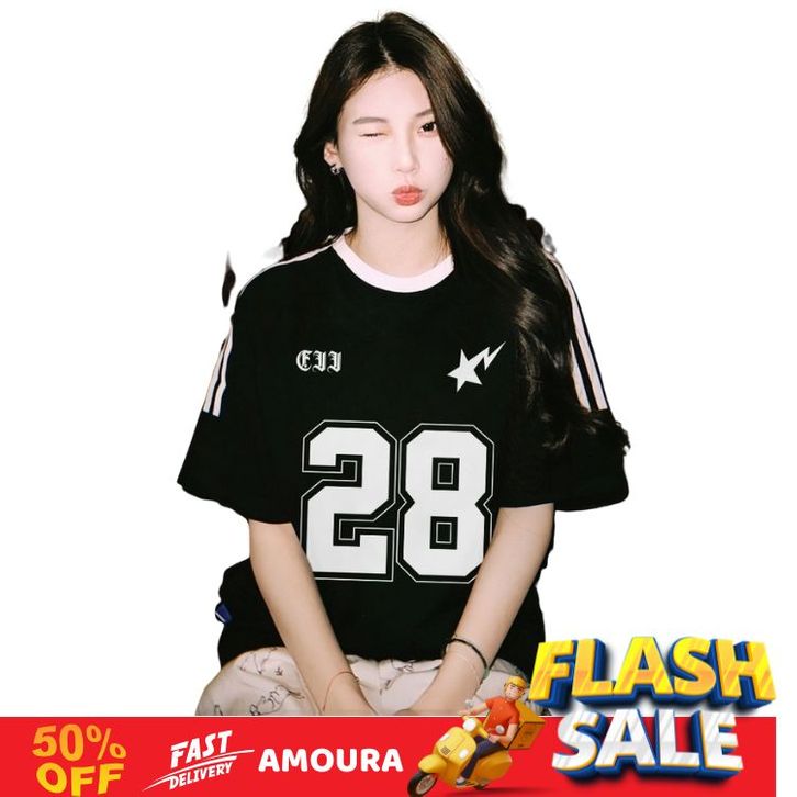 AMOURA - Baju Wanita Putih Black Kaos Premium Lengan Pendek Oversize Kaos Motif Angka 28 Atasan Wanita Kekinian Korean