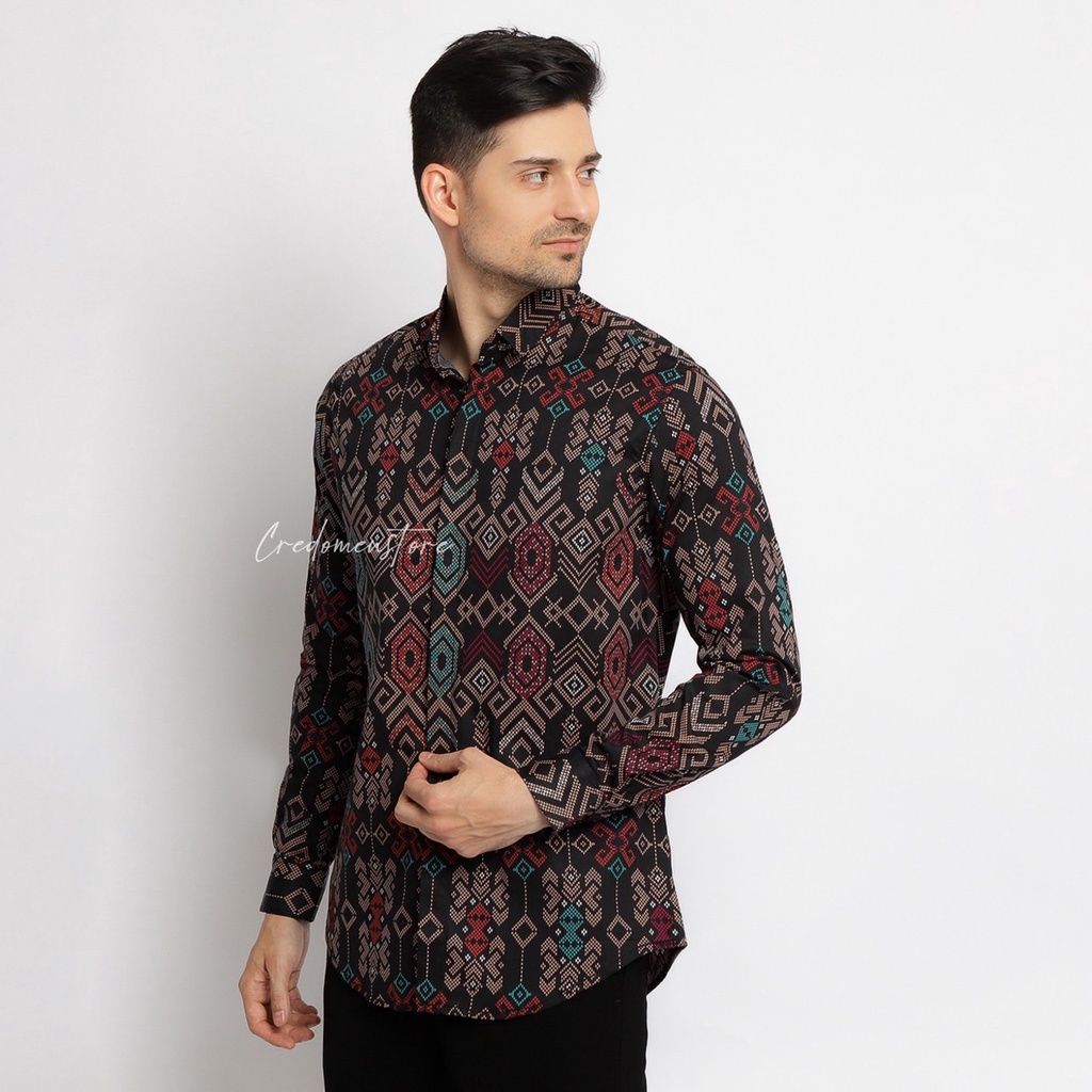 CREDOMENSTORE KEMEJA BATIK PRIA LENGAN PANJANG SONGKET HITAM / BAJU BATIK COWOK